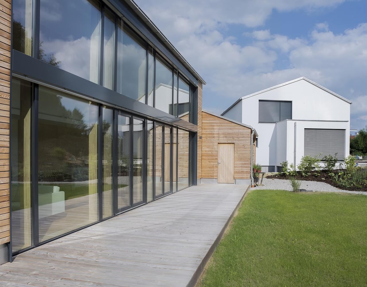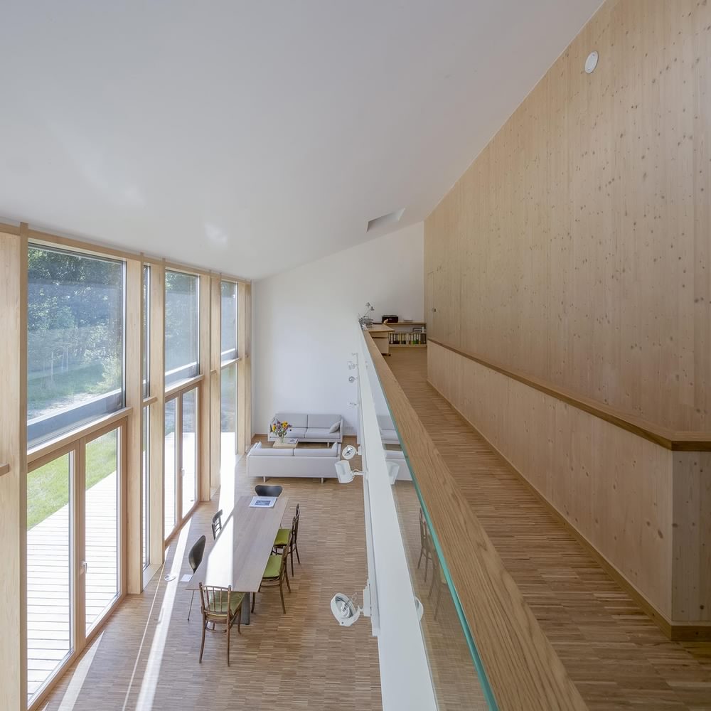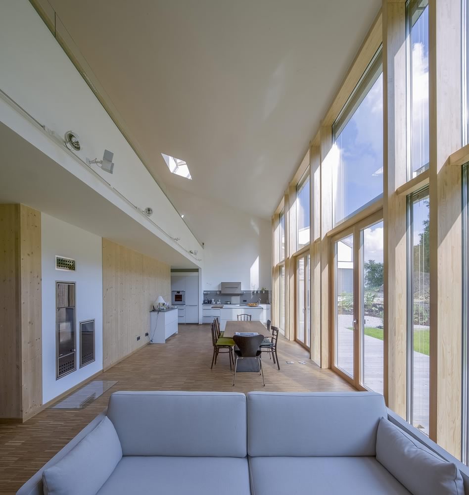 Kuća u Dorfenu od 150 kvadrata, čiji projekat potpisuju Wolfertstetter Architektur, na izgled ne deluje previše toplo pre svega zbog ogromne staklene fasade od oko 60m². Ipak, stvari stoje sasvim drugčije. Pre svega, staklena površina okrenuta je na jugozapad, odakle i dolazi najveći priliv sunčeve energije, a kao drugo, radi se o trostrukim prozorima izrađenim u kombinaciji drvo-alumijum.
