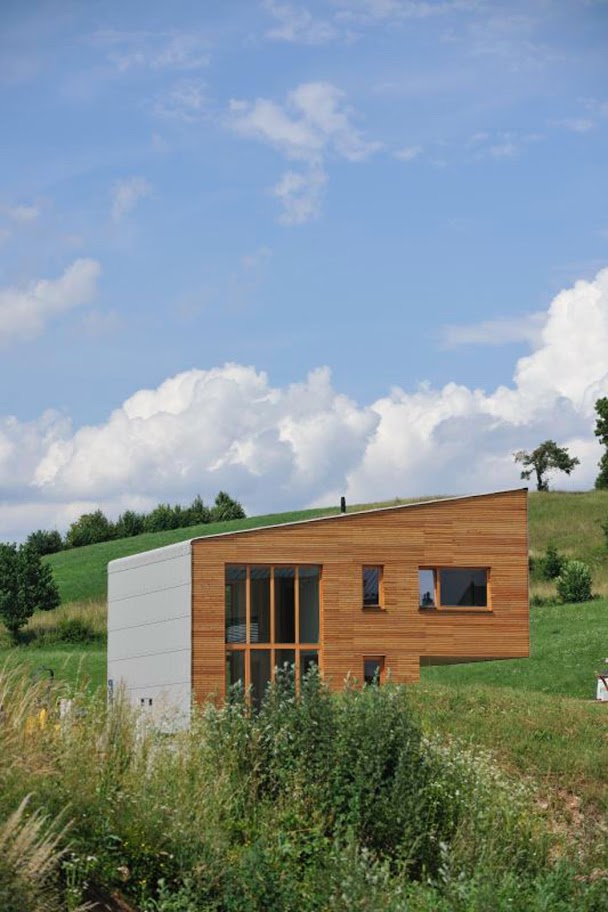 Odličnim korišćenjem nagnutnog terena nastala je kuća zanimljive fasade i sjajnih arhitektonskih rešenja.