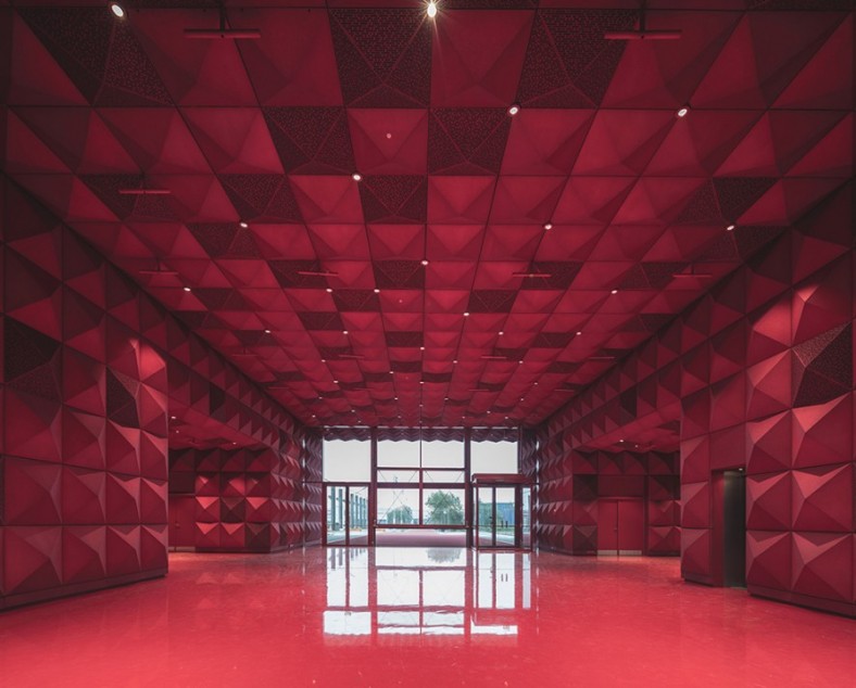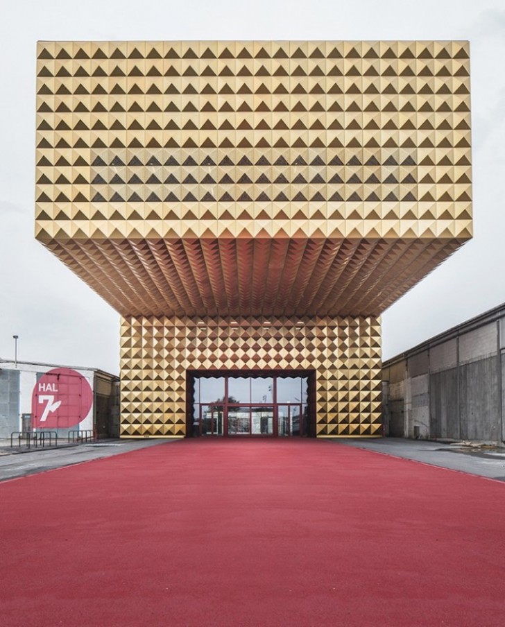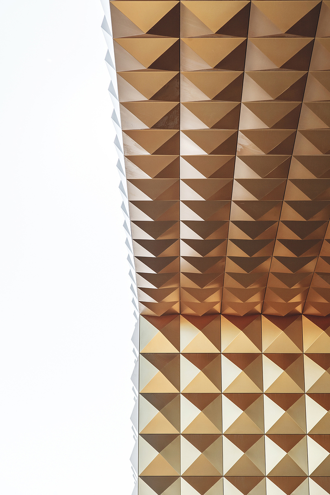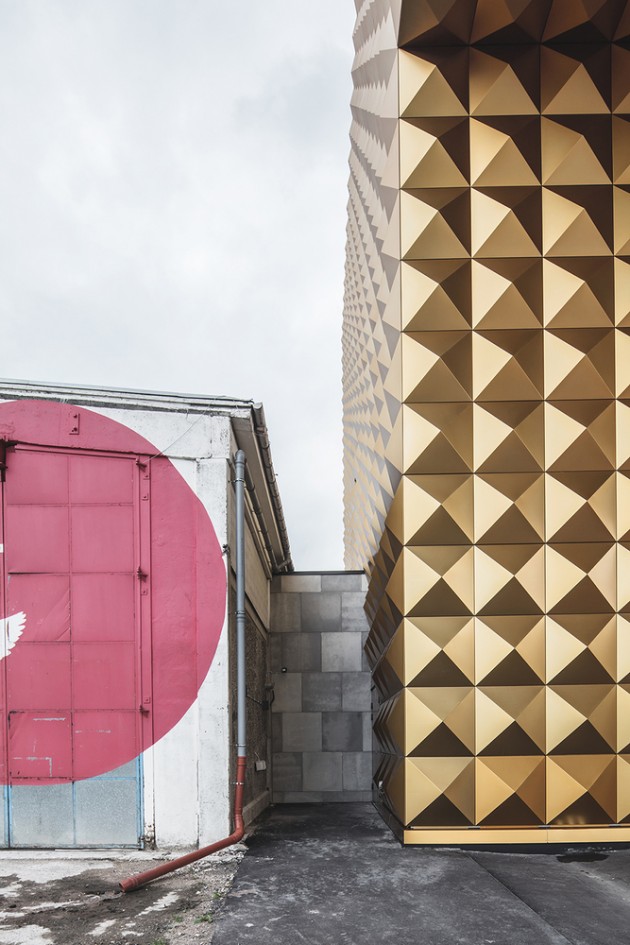 Fasada je izvedena od zlatnih panela piramidalne forme koji treba da podsećaju na zvučnu izolaciju u muzičkim studijima.