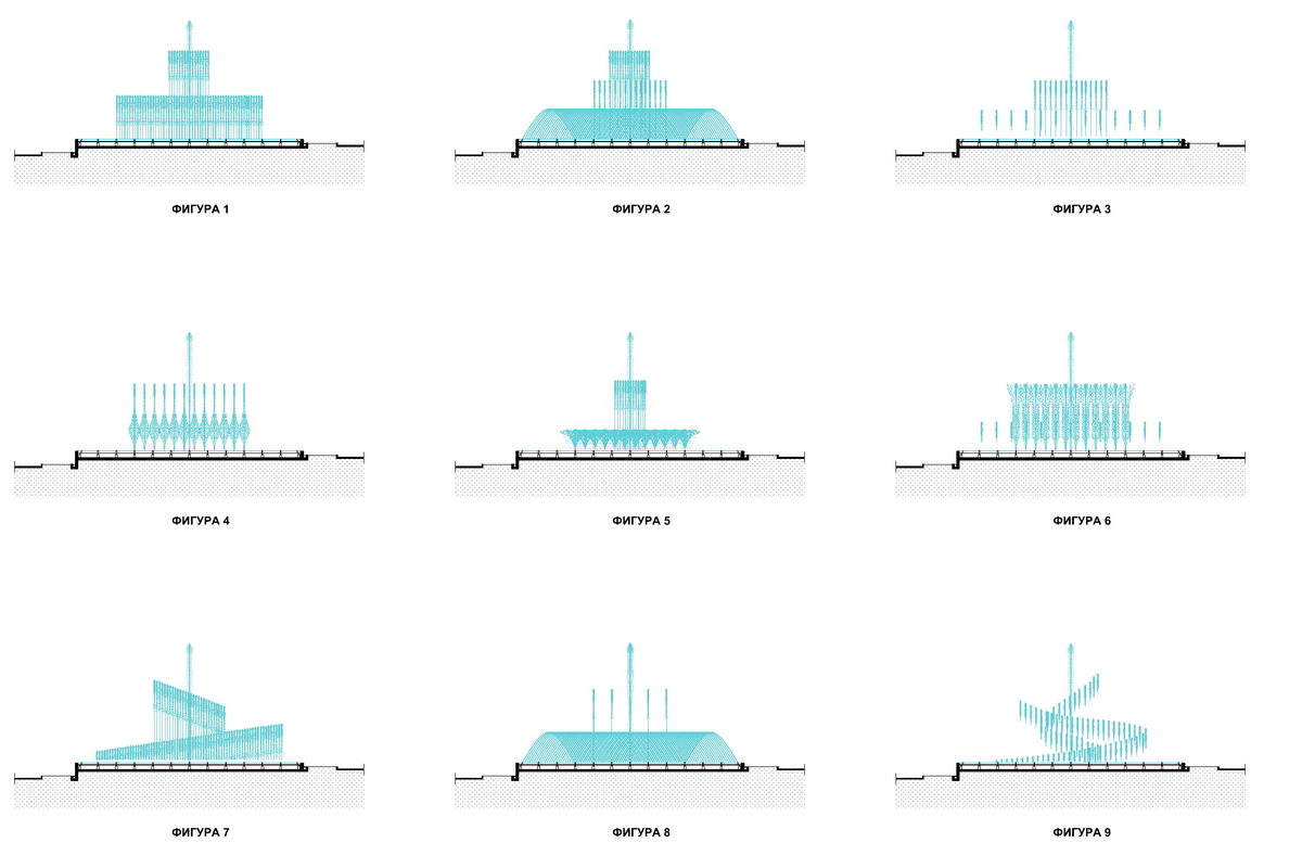 Bazen fontane biće prelivnog karaktera, izgrađen od armiranog betona i presvučen granitnim pločama svetlo sive boje. Unutar bazena će se nalaziti velika centralna mlaznica okružena sa šest koncentričnih krugova vertikalnih mlazova različite veličine. Visina mlazova raste od oboda ka centru, pa će maksimalna visina mlaza na obodu biti 6 metara, dok će centralna mlaznica biti u mogućnosti da u maksimumu kapaciteta dosegne čak 16 metara. Pored toga, mesingane mlaznice imaće podesive zglobove što pruža razne mogućnosti u oblikovanju vodene atrakcije.