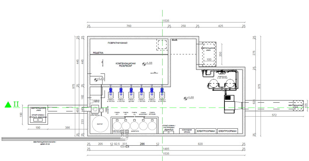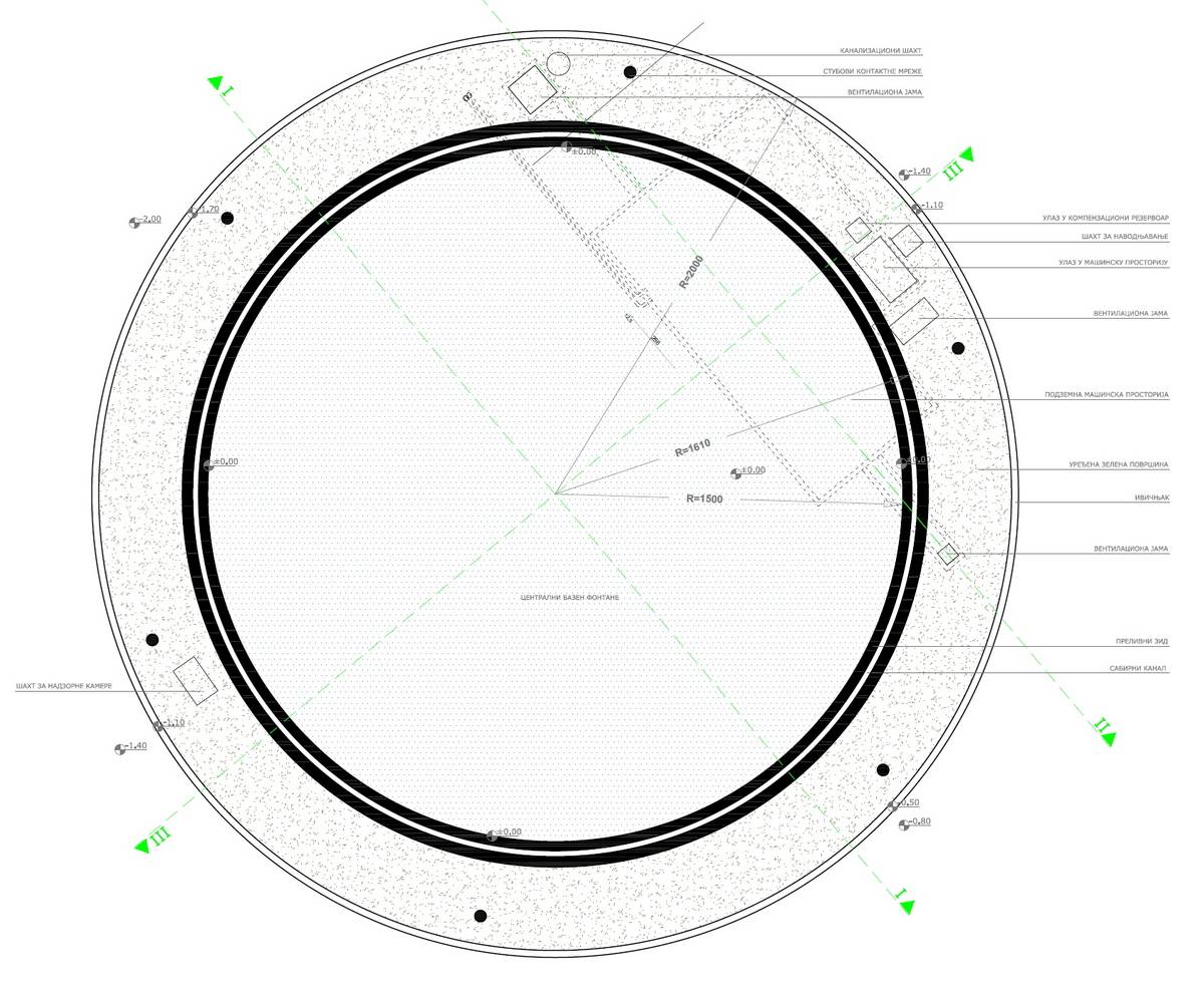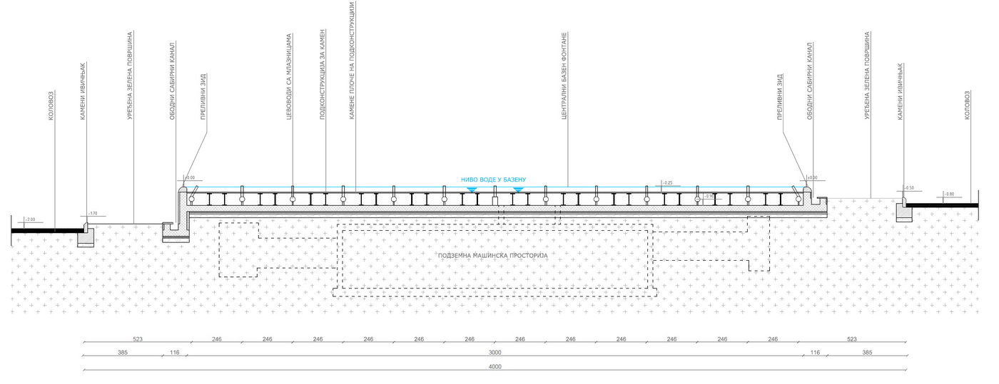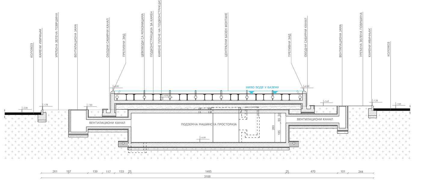 Voda iz velikog bazena prelivaće se u obodni kanal, a oko fontane je planiran ozelenjen kružni prostor sa cvetnim aranžmanima (Lavandula angustifolia i Veronica spicata Heidekind). Ispod bazena fontane planirana je mašinska soba, sa složenim sistemom rezervoara i pumpi, kao i sistem flitera za tretman vode.