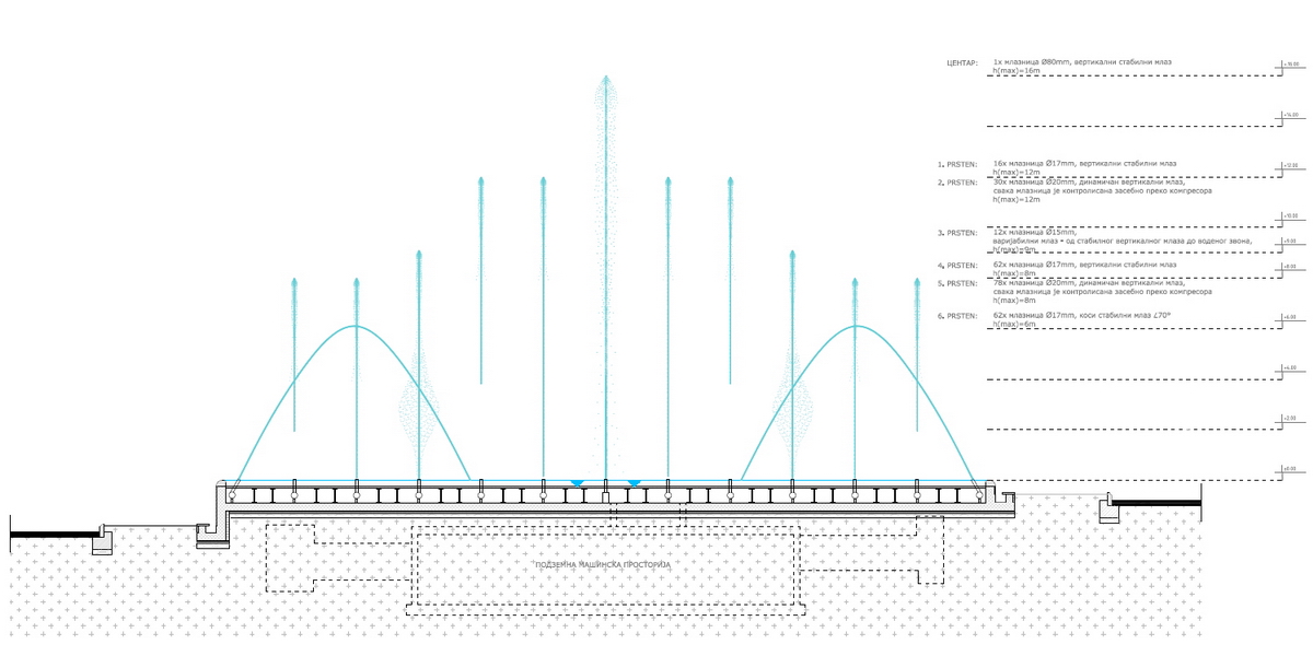 Centralna mlaznica u bazenu fontane biće u mogućnosti da u maksimumu kapaciteta dosegne visinu od čak 16 metara.