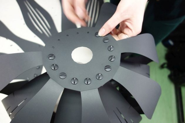 Za fabrikovanje finalnih proizvoda kombinovana su dva različita materijala, crni hamer papir velike gramaže i crni šrafovi koji povezuju delove abažura. Svaki abažur sastavljen je tako da je moguće njegovo sklapanje i rasklapanje. Opcija rastavljanja cele strukture na više segmenata je pogodna zbog pakovanja abažura u kutiju, što omogućava jednostavan transport. U kutijama se osim delova abažura nalaze i brošure sa detaljnim uputstvom za sklapanje.