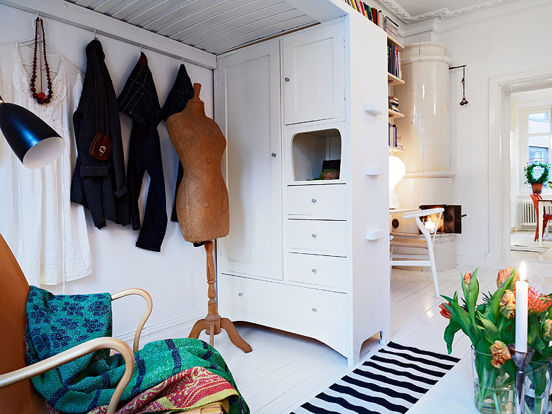 Ceo stan je ofarban u belu boju koja vizuelno povećava prostor. Pojedini elementi kao što je sofa i tepih su crne boje. U dnevnoj sobi se izdvaja starinski ormar postavljen uz zid.