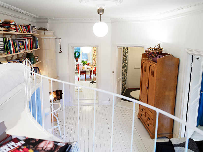 U prostoru dnevne sobe napravljena je galerija i od nje napravljen krevet. Uz ivicu je postavljena ogradica pa ovaj deo dnevne sobe podseća na romantičan balkon. U prostor ispod je smešteno odlaganje stvari i udobna narandžasta fotelja.