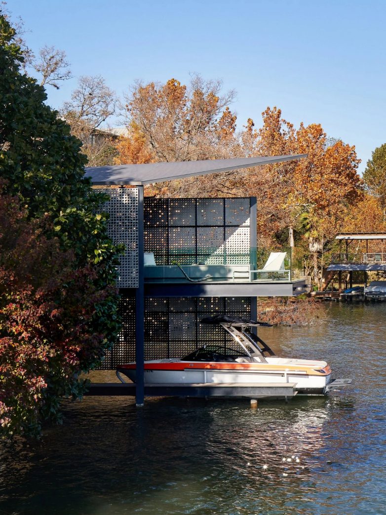 Arhitektonski studio Matt Fajkus Architecture iz Ostina dizajnirao je mali, a istovremeno veoma zanimljiv objekat, čija perforirana metalna fasada osim što doprinosi estetici, omogućava i balans svetlosti i senke tokom cele godine. Filtered Frame Dock je dvoetažni objekat za čamce ali i za relaksaciju korisnika, a izgrađen je u neposrednoj blizini stambene kuće, piše Dezeen.