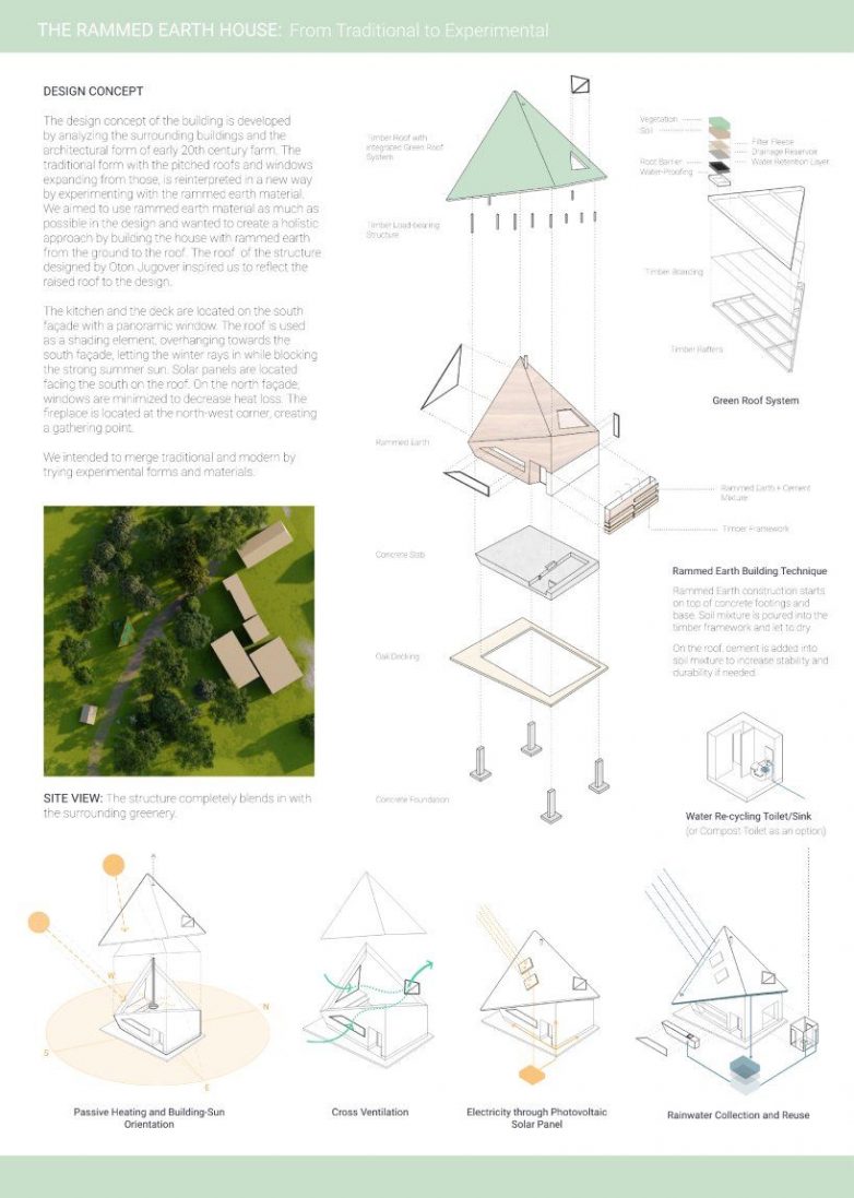 Predviđeno je da ploča kuće, kao i temelji, budu izvedeni od betona. Hrastovina bi se koristila za izgradnju okolnog trema i nameštaja, dok bi zidovi bili izvedeni korišćenjem drvenih okvira, koji bi se ispunili nabijenom zemljom.