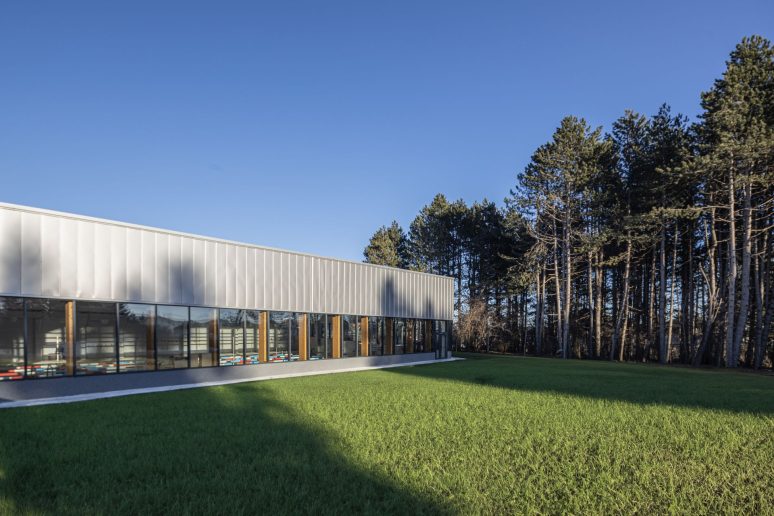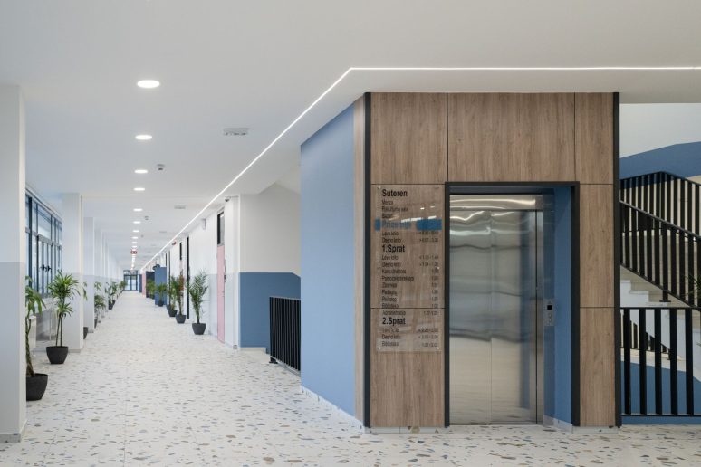 “Objekat je podeljen na krilo namenjeno nižim razredima i krilo namenjeno višim razredima škole koja se spajaju na samom uglu, formirajući hol koji po potrebi postaje višenamenski, svečani prostor”, kaže arhitekta.