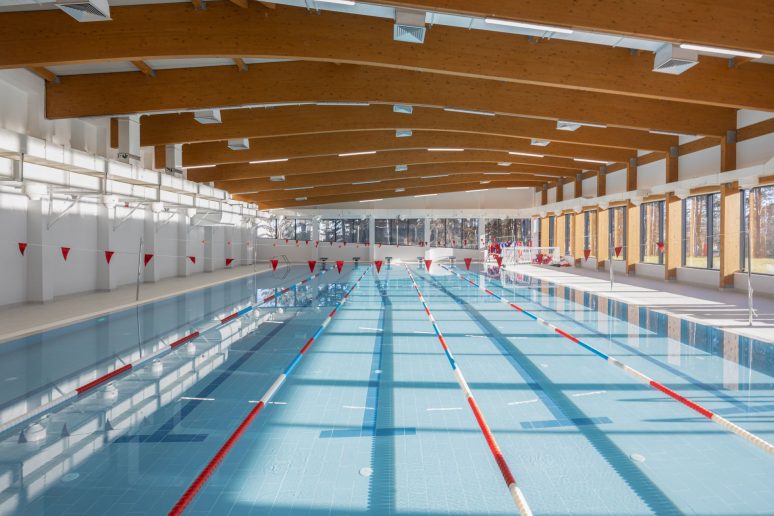 Sala i bazen su konstruisani od lepljenog lameliranog drveta pa se motiv šume i drveta čita i u unutrašnjem prostoru.