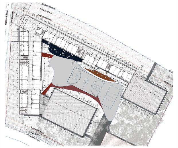 Objekat škole je najdominantniji, zauzima ugaonu poziciju na parceli i u direktnoj je interakciji sa okruženjem.