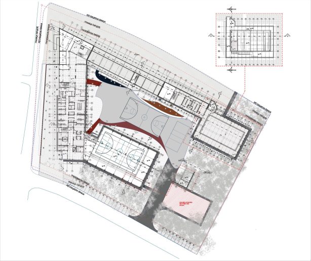 “Tri objekta – škola, fiskulturna sala i bazen, se formalno čitaju kao zasebni objekti iako se, spojeni toplim vezama, preklapaju i uranjaju u teren transformišući se u jedinstvenu funkcionalnu celinu. Motiv šume ukazuje na mir, kojem se suprotstavlja dinamičnost saobraćajnica koje okružuju lokaciju” – kaže Grahovac i nastavlja: