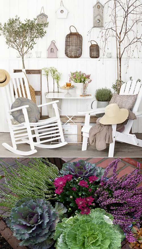 3. Detalji i biljke za zimu. Jednostavne ideje i raskošne boje na belom pokrivaču izgledaće vrlo zanimljivo. Nabavite kućice za ptice, stare kuhinjske stolice, šišarke ili bilo koji drveni detalj i ofarbate ga u vašu omiljenu boju. Predmete rasporedite u obliku skulptura.