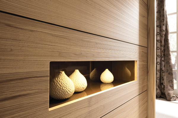 Drvo od kojeg su izvedena klizna vrata se pojavljuje i na ostalim elementima spavaće sobe: krevetu, natkasni i konzolnoj polici. Bojeno staklo na frontu ormara služi i kao zatamljeno ogledalo.