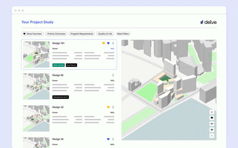 Delve je alat za generativni dizajn koji kreira osnove celih stambeno-poslovnih kompleksa na osnovu vaših inputa. Recite mu na kom mestu gradite, kolika je spratnost i indeks izgrađenosti a on će vam ponuditi nekoliko rešenja u nekoliko minuta. Cilj alata je da pojednostavi razvojni proces ne samo arhitektama već i developerima.