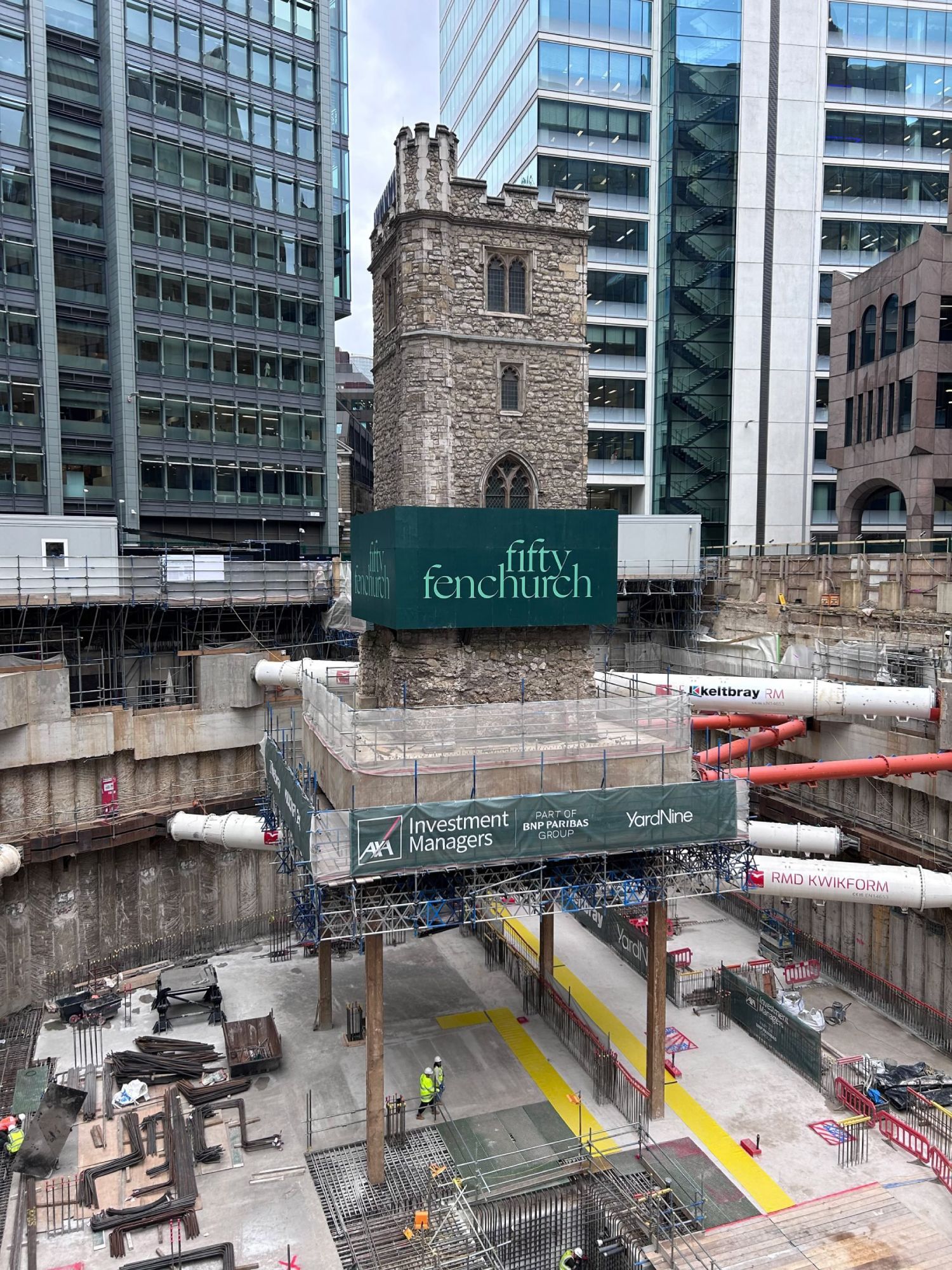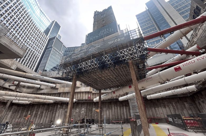 Četiri čelična stuba drže kameni toranj crkve 14 metara iznad gradilišta, gde je početkom proše nedelje obeležena ceremonija „najdublje tačke iskopa“. Oko iskopanog prostora u samom centru Londona, postavljene su cevne konstrukcije koje podupiru zidove.