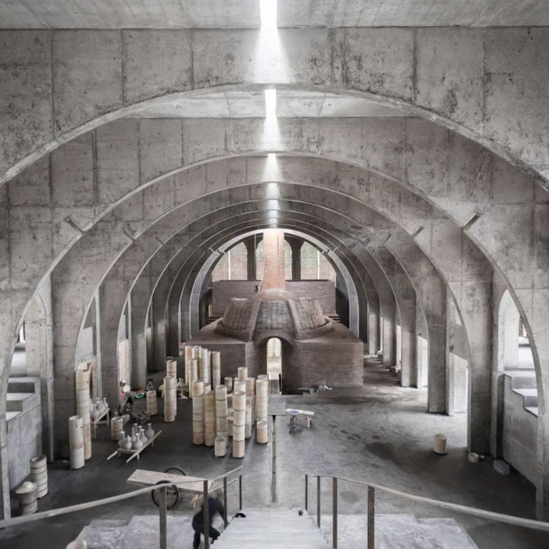 Lučni oblik fabrike BingDing osmišljen je tako da uspostavi sklad sa monumentalnom peći u obliku jajeta, koja se nalazi u njenom središtu. Arhitekte su koristile beton kojim su „ušuškali“ peć na drva, koja se i dalje koristi pravljenje porcelana.