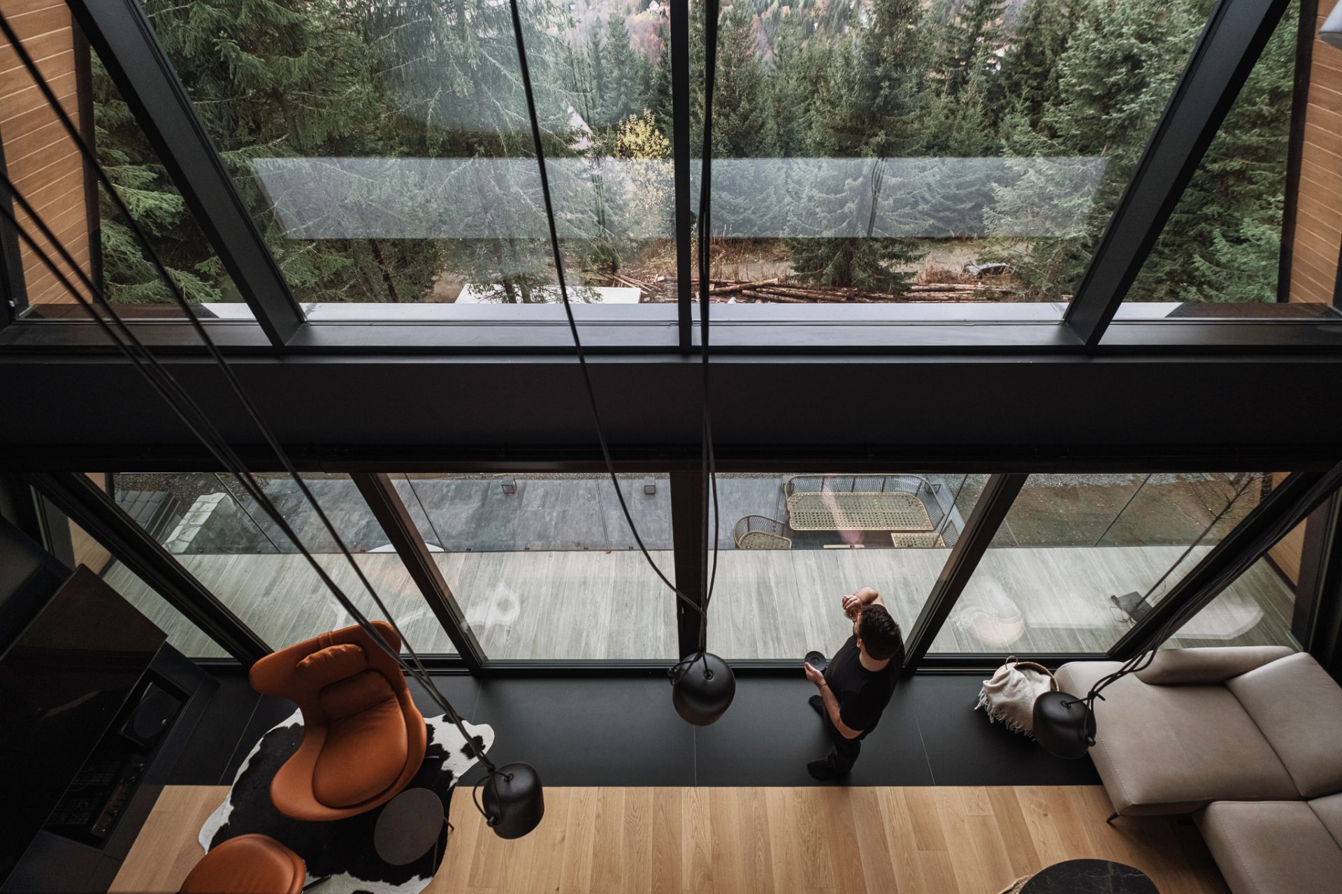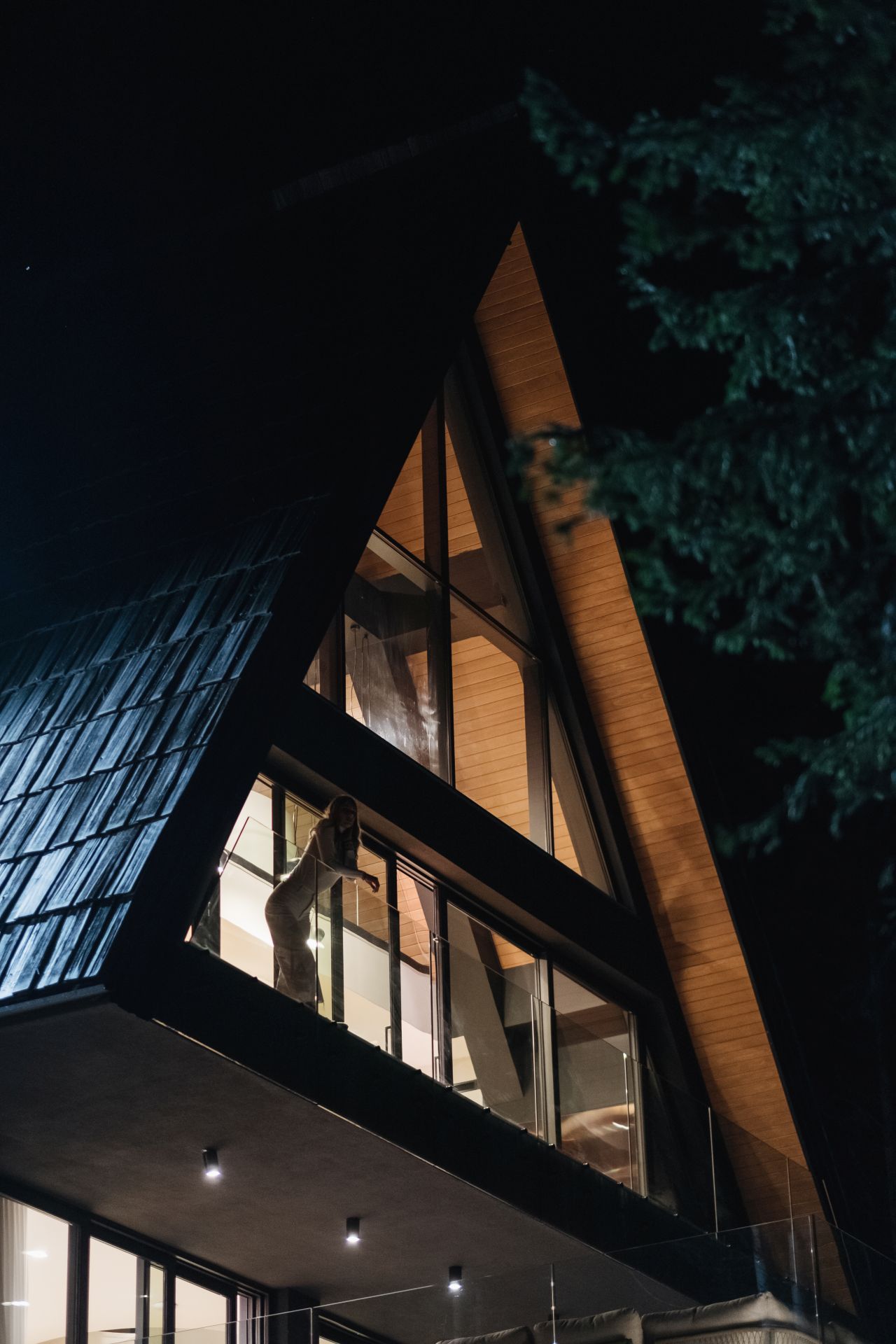 Antracit boja kuće stapa se s tamno zelenim borovima tokom letnjih meseci, dok se zimi oblik kuće koristi kao efikasan način zadržavanja snega na krovu, čime se postiže harmonija sa zimskim pejzažom.