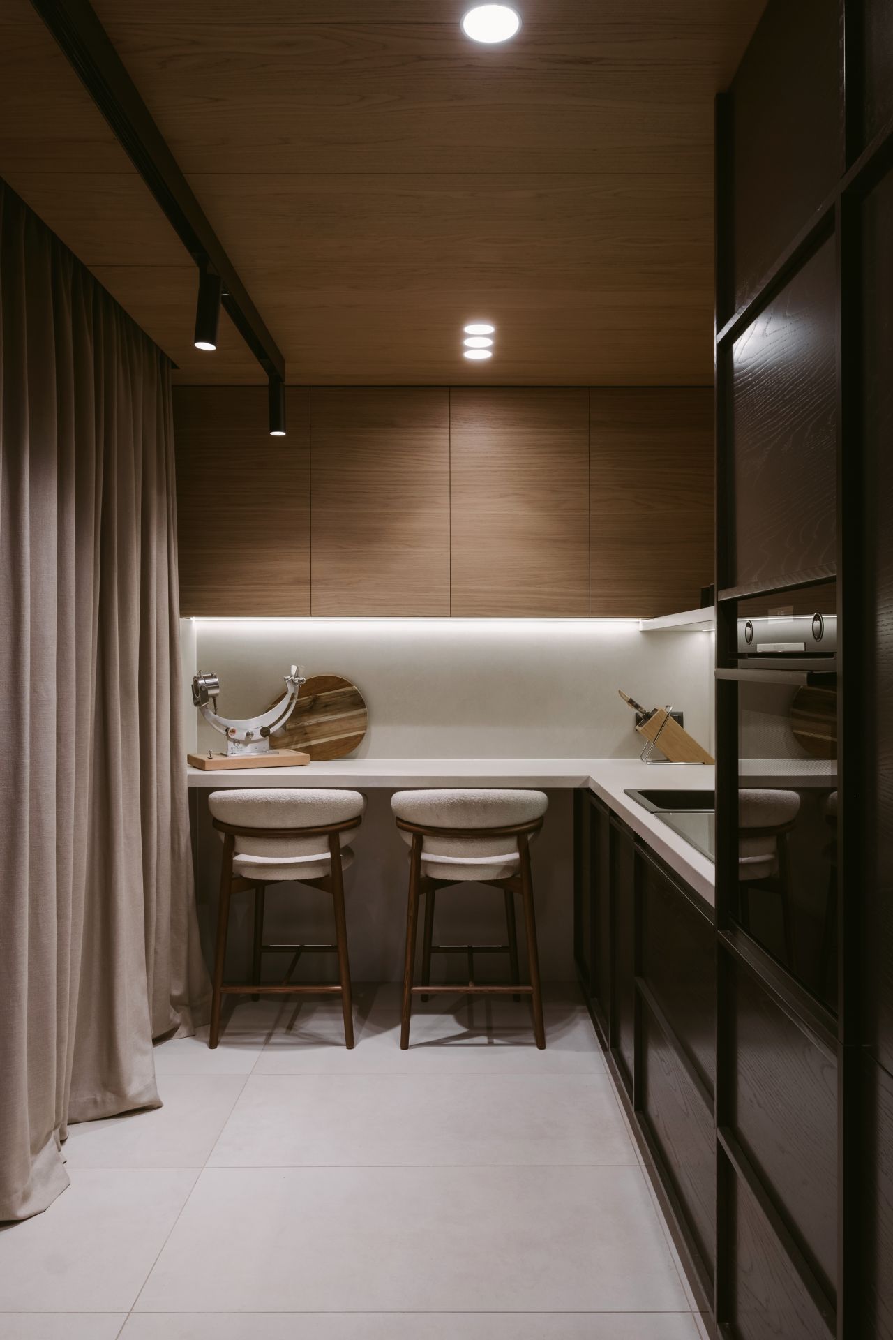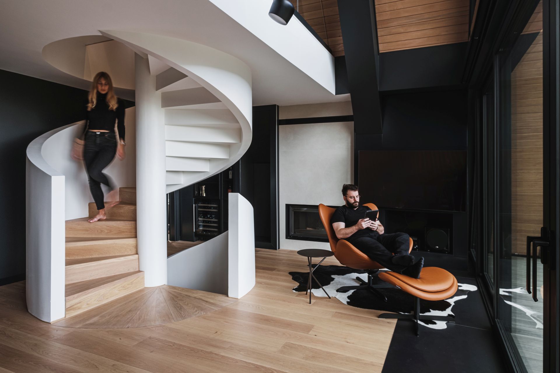 „Dizajn enterijera prati stil moderne planinske kuće, koristeći dekor dezena od drveta, keramike u svetlim peščanim tonovima, i naglašavajući antracit, gotovo crni ton koji hrabro oblikuje prostor i povezuje ga sa eksterijerom“ – kaže osnivačica studija.