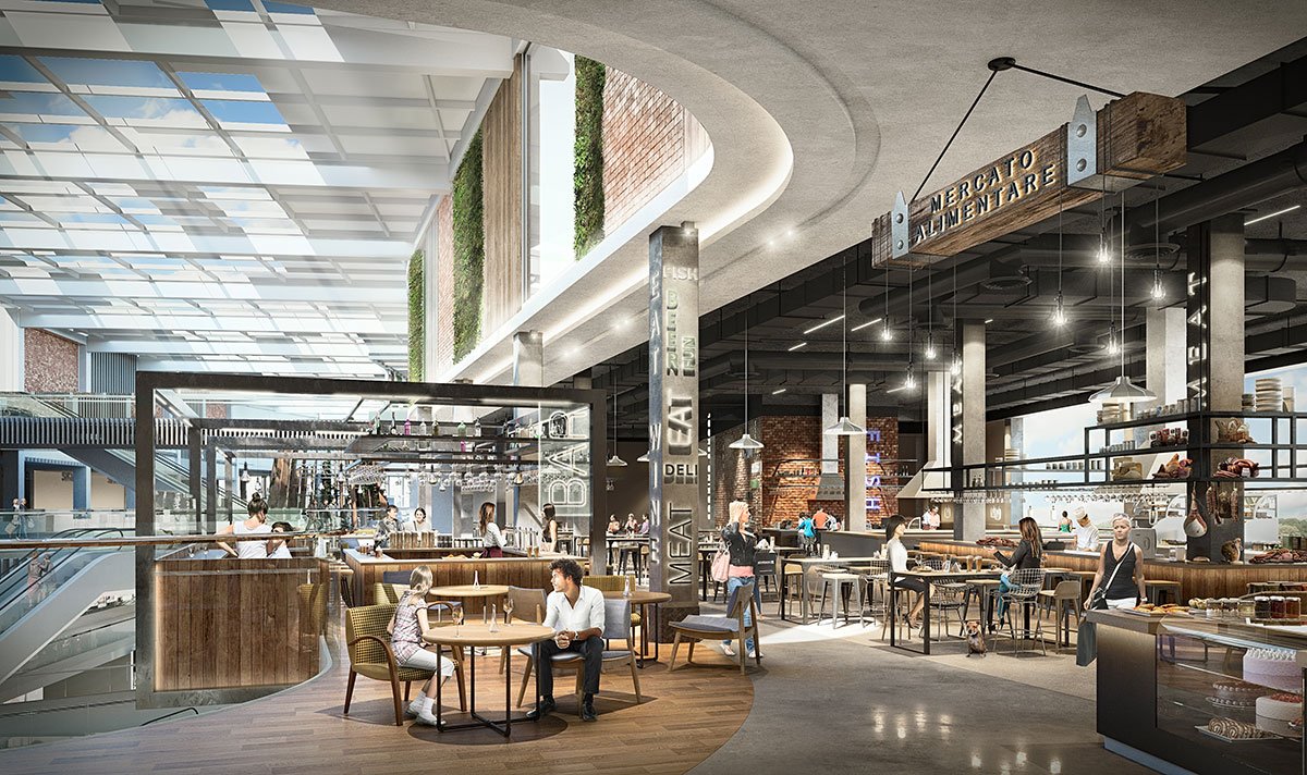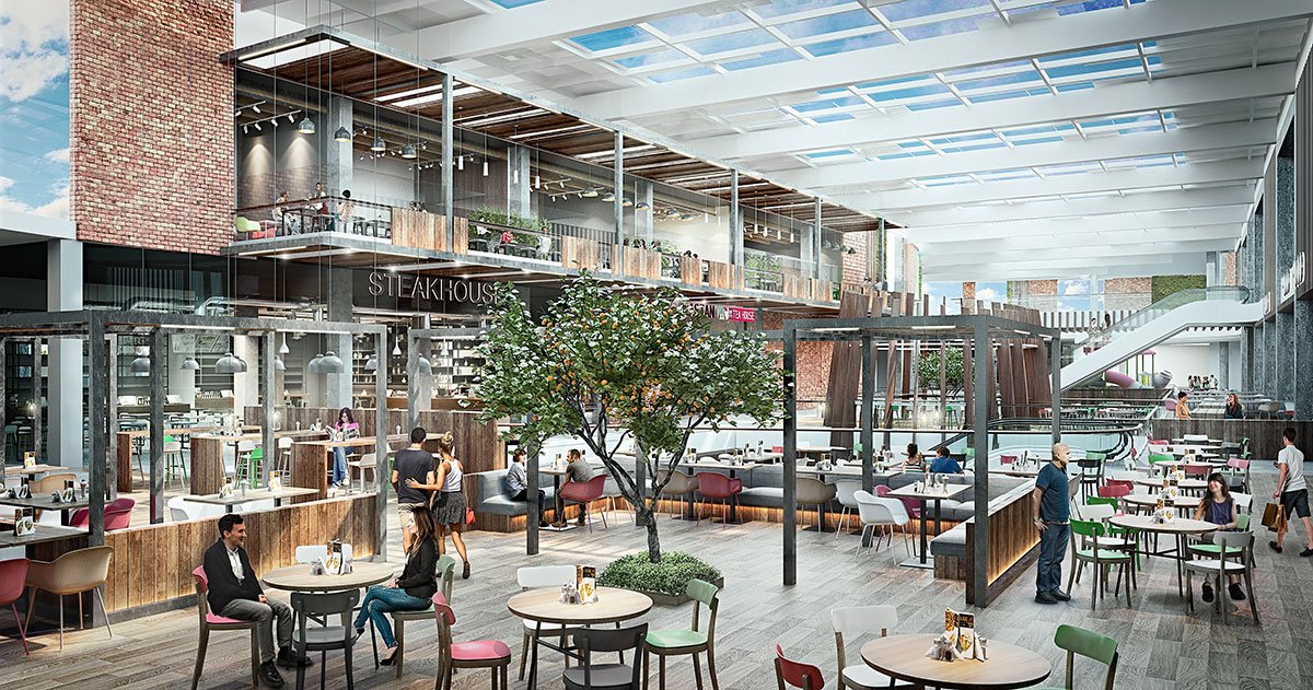Korišćenjem dekorativne opeke, drvenih elemenata, pločica koje imitiraju drvenu teksturu ali i zelenilu, enterijer ovog šoping centra deluje toplo i ušuškano što, naravno, ima za cilj da kupce drže zadrži u šopingu.