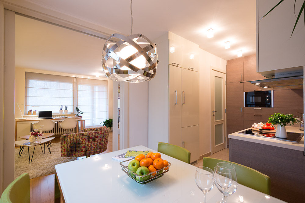 Stan ima sjajan raspored prostorija, pa se u kuhinju s trpezarijom može ući i iz hodnika, ali i dnevne sobe. Trpezarija je odvojena od dnevne sobe kliznim staklenim vratima koja je fiksirana za plafon, tako da na podu nema neugledne šine.