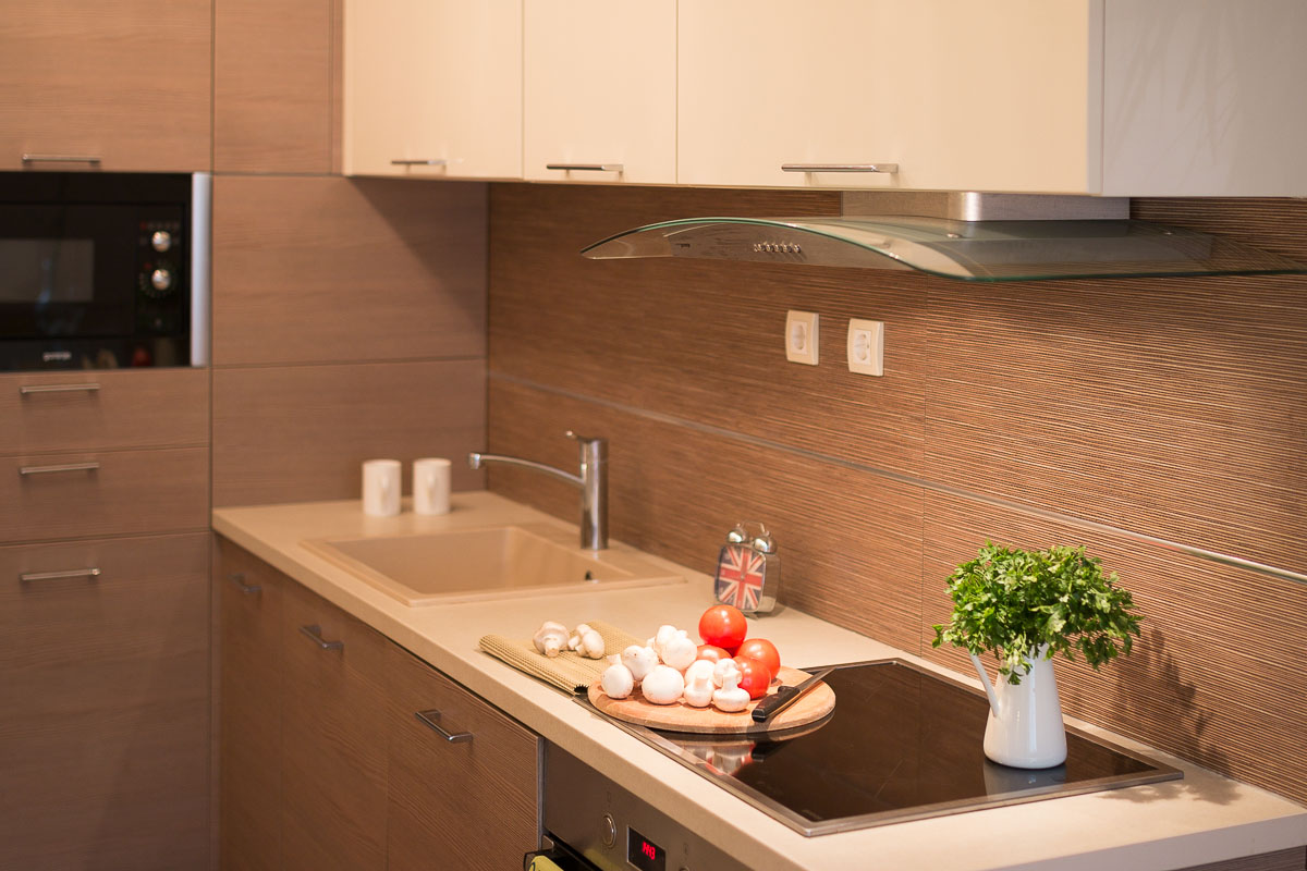 Glavni izazov u kuhinji bio je kako napraviti što više mesta za odlaganje. Zato je ceo jedan zid iza vrata urađen kao plakar u braon univeru dubine 40 centimetara. Takođe, niša prema trpezariji iskorišćena je za smeštanje ugradnog frižidera pored kojeg se nalazi džambo plakar. Sve je to upakovano u bojeni medijapan (MDF), kuhinjski elementi takođe su izvedeni od univera, s tim što su viseći elementi u bojenom medijapanu.