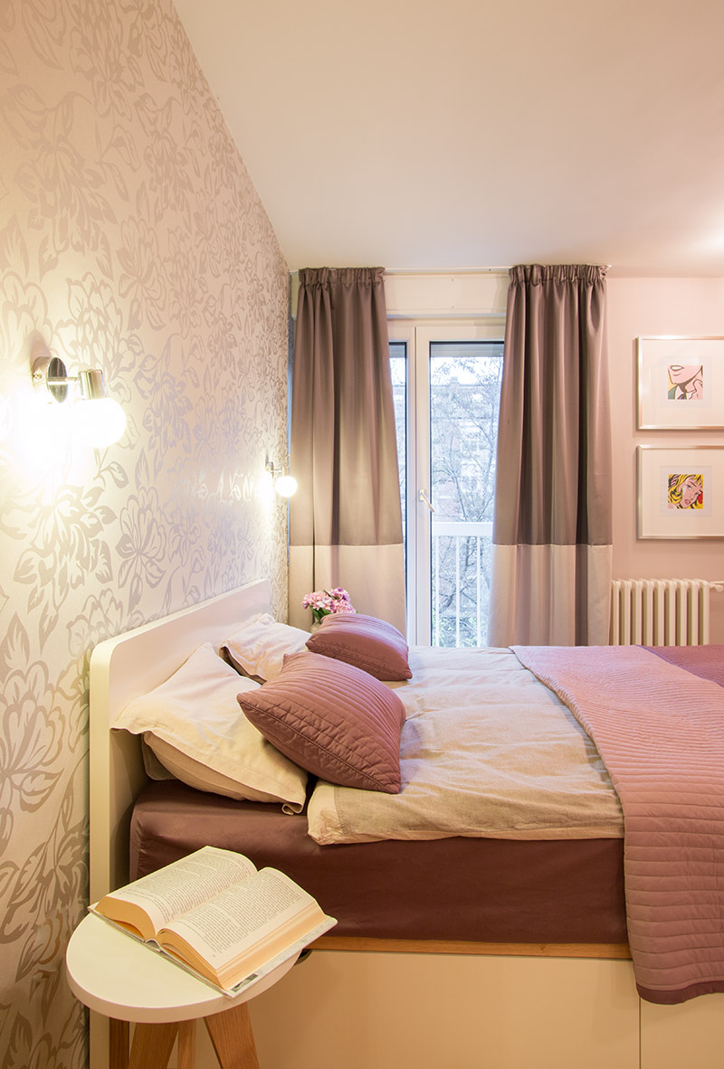 Spavaćom sobom dominira umirujuće lila boja u više nijansi, što je idealna kombinacija ukoliko želite ušuškan enterijer. Osnova je bila tapeta iza kreveta sa cvetnim dezenom, a potom su došli draperi koji su pratili kolorit. Bitno je obratiti pažnju na detalje kao što su noćni stočići, ali i na posteljinu koja će dati ton i karakter svakoj spavaćoj sobi.