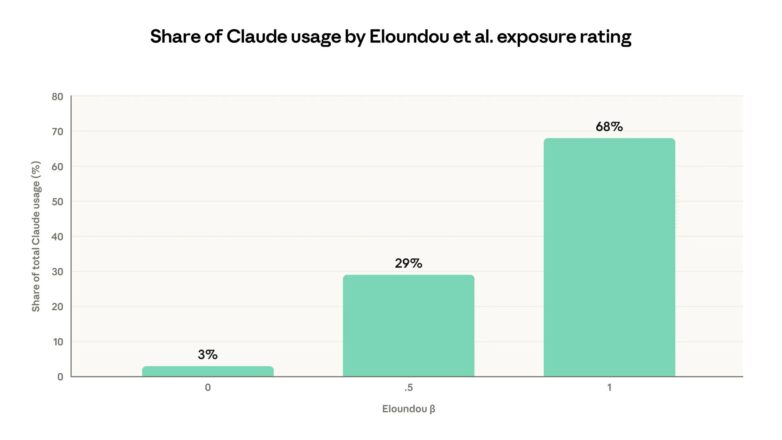 Rad objavljen početkom meseca analizira razliku između stvarne i teorijske zamene zadataka programima veštačke inteligencije, na osnovu metrike nazvane „izloženost“. Studija nazvana Uticaji veštačke inteligencije na tržište rada: Nova mera i rani dokazi, koristi podatke korisnika Anthropicovog modela Claude kako bi uporedila stvarnu i teorijsku izloženost.