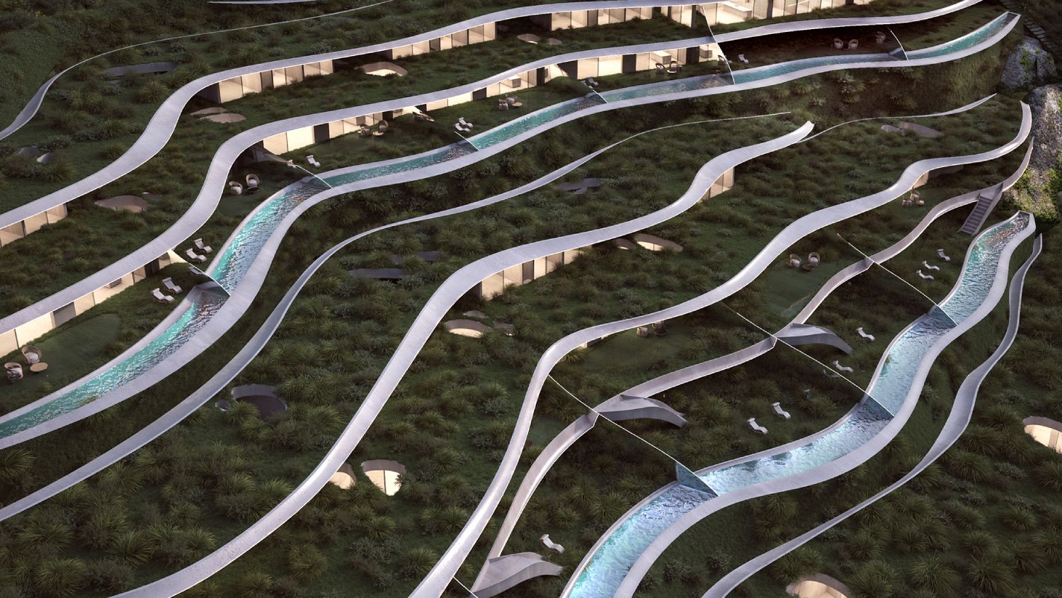 Kompleks prati koncept amfiteatarskog rasporeda, dok je svaka pojedinačna struktura dizajnirana kao krivudava fluidna forma.