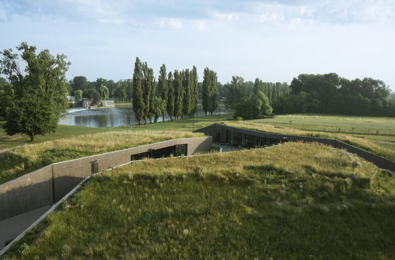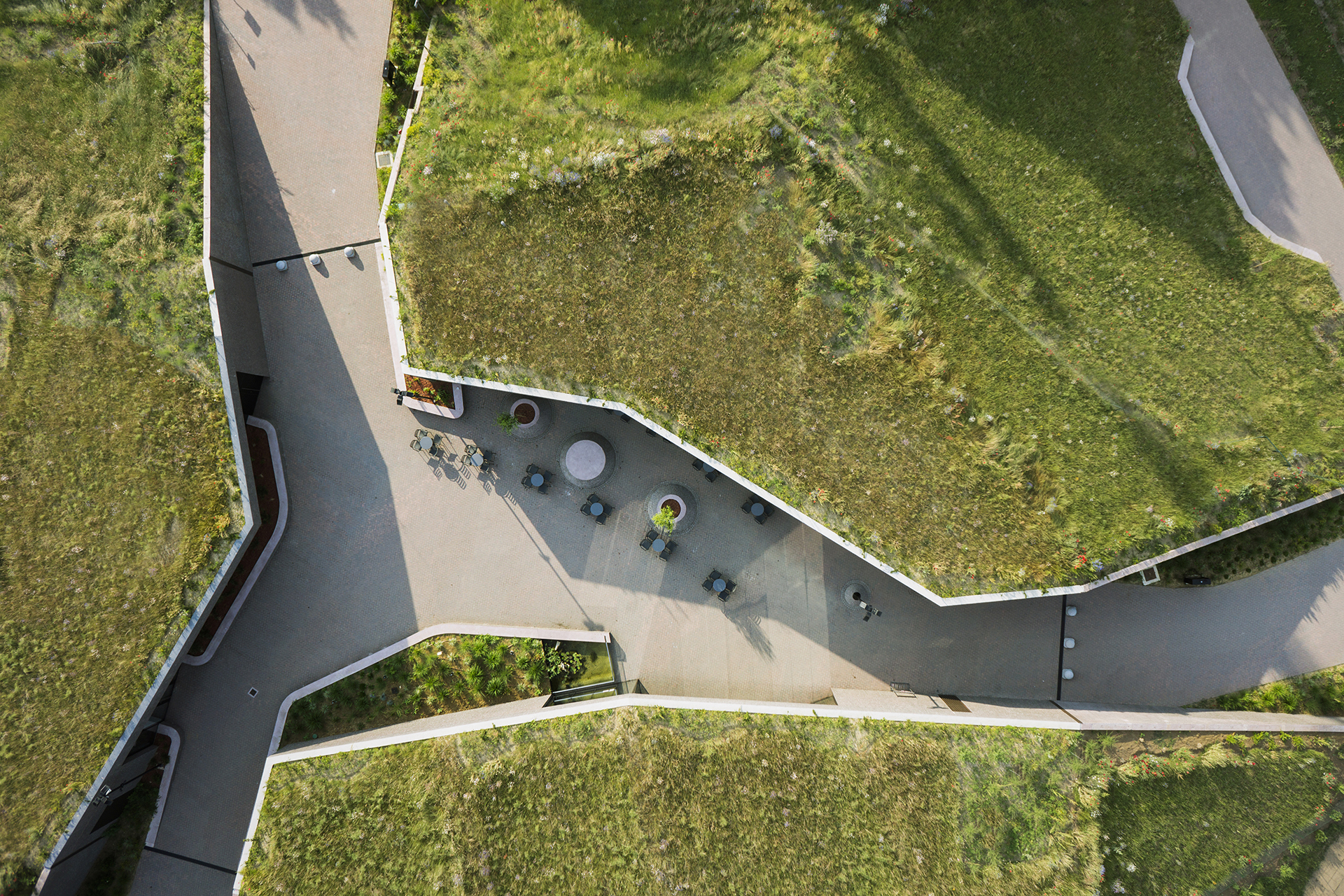 Stražnje strane i krovovi objekata nasuti su zemljanim materijalom i deluju kao deo parka, igrališta odnosno šetališta.