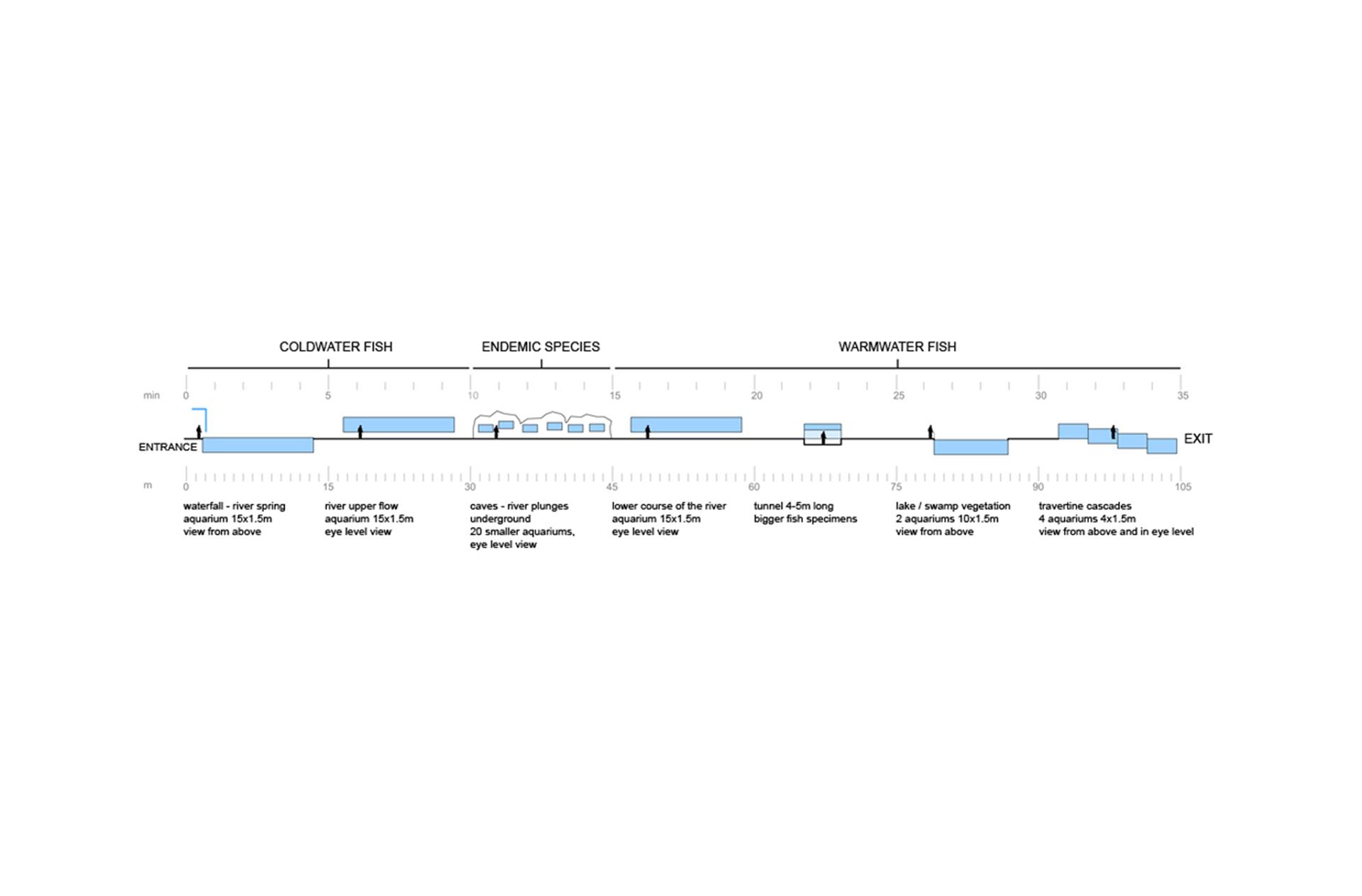 U centru objekta od 2.915 kvadrata formiran je javni prostor trga iz kojeg se šire tri glavna pešačka pravca koji zgradu akvarijuma dele na tri objekta – izložbu, čitaonicu s kafe-barom i kancelarijske prostore.