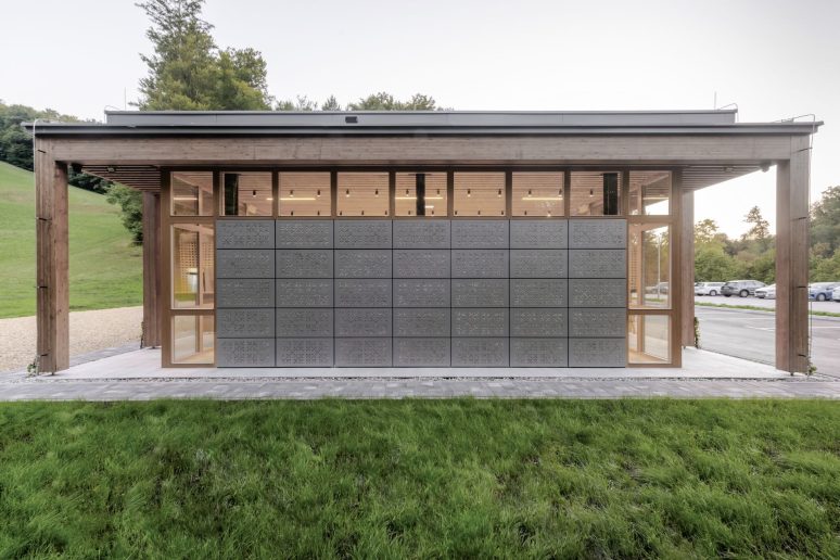 Drveni višenamenski paviljon u Sloveniji odlikuju veliki rasponi i obodna nadstrešnica visine 8 metara koja povezuje sve programske celine.