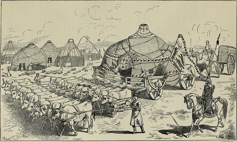 Bitno je pomenuti da su Mongoli bili poznati po svojim jurtama. Istorijski podaci prikazuju šator Džingis Kana kao izuzetno veličanstven i složen, a postavljen na platformu prečnika 9 metara, koja je imala točkove, te su šator vukla kola sa 22 vola.