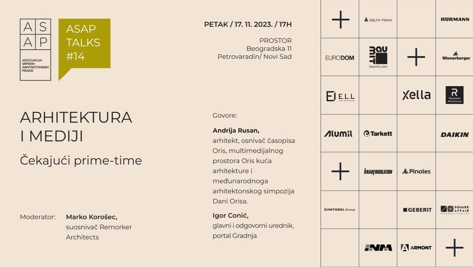 Asocijacija srpskih arhitektonskih praksi najavila je 14. po redu ASAP TALKS događaj, koji će se pod naslovom „Arhitektura i mediji: Čekajući prime-time“ održati u petak, 17. novembra, u kreativnom centru „Prostor“ u Petrovaradinu.