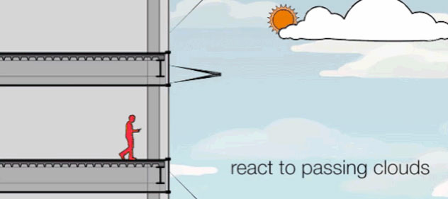 Kada sunce sija, roletne će biti spuštene ali kada se osoba primakne prozoru one će se podići kako bi omogućili neometan pogled ka spolja. S druge strane, ako kretanje oblaka privremeno zaseni sunčeve zrake roletne će reagovati tako što će se razmaći i time omogućujući prodor veće količine svetlosti u unutrašnjost objekta.
