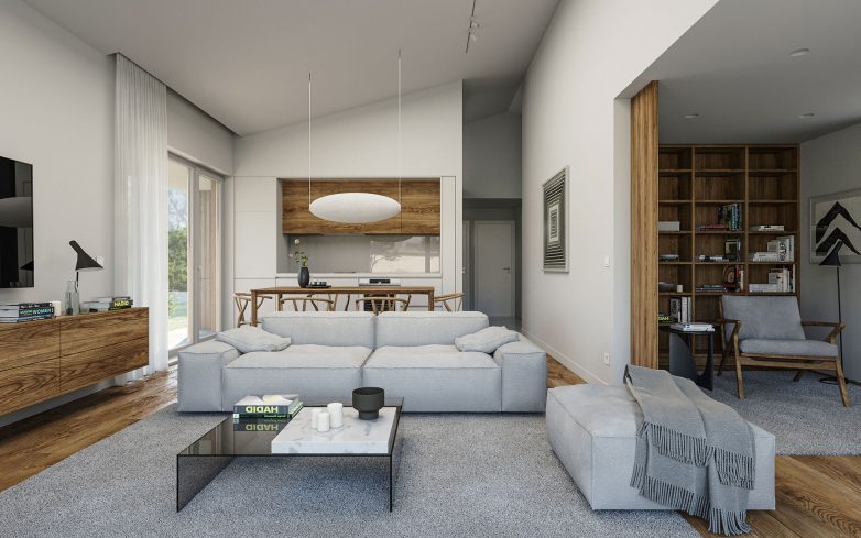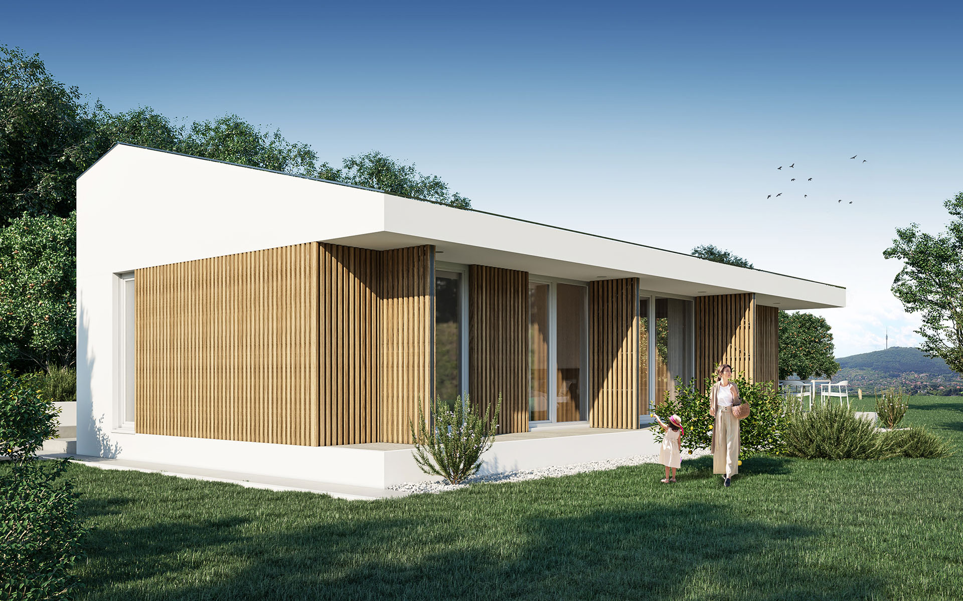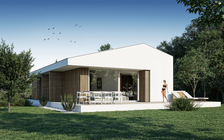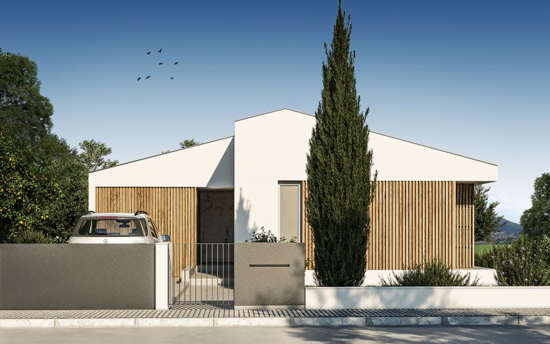 Fasada kuća je kombinovana. Čine je velike bele površine kontakt fasade (termoblok i kamena vuna), ali i delovi ventilisane fasade koju prekrivaju drvene letvice.