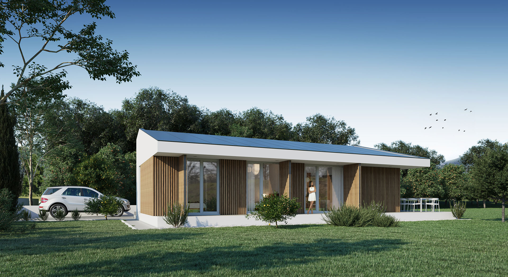 Sve kuće imaju dvovodan, asimetričan krov pokriven falcovanim limom. Kos krov omogućava formiranje različitih spratnih visina u enterijeru, što doprinosi bogatstvu prostornog doživljaja.