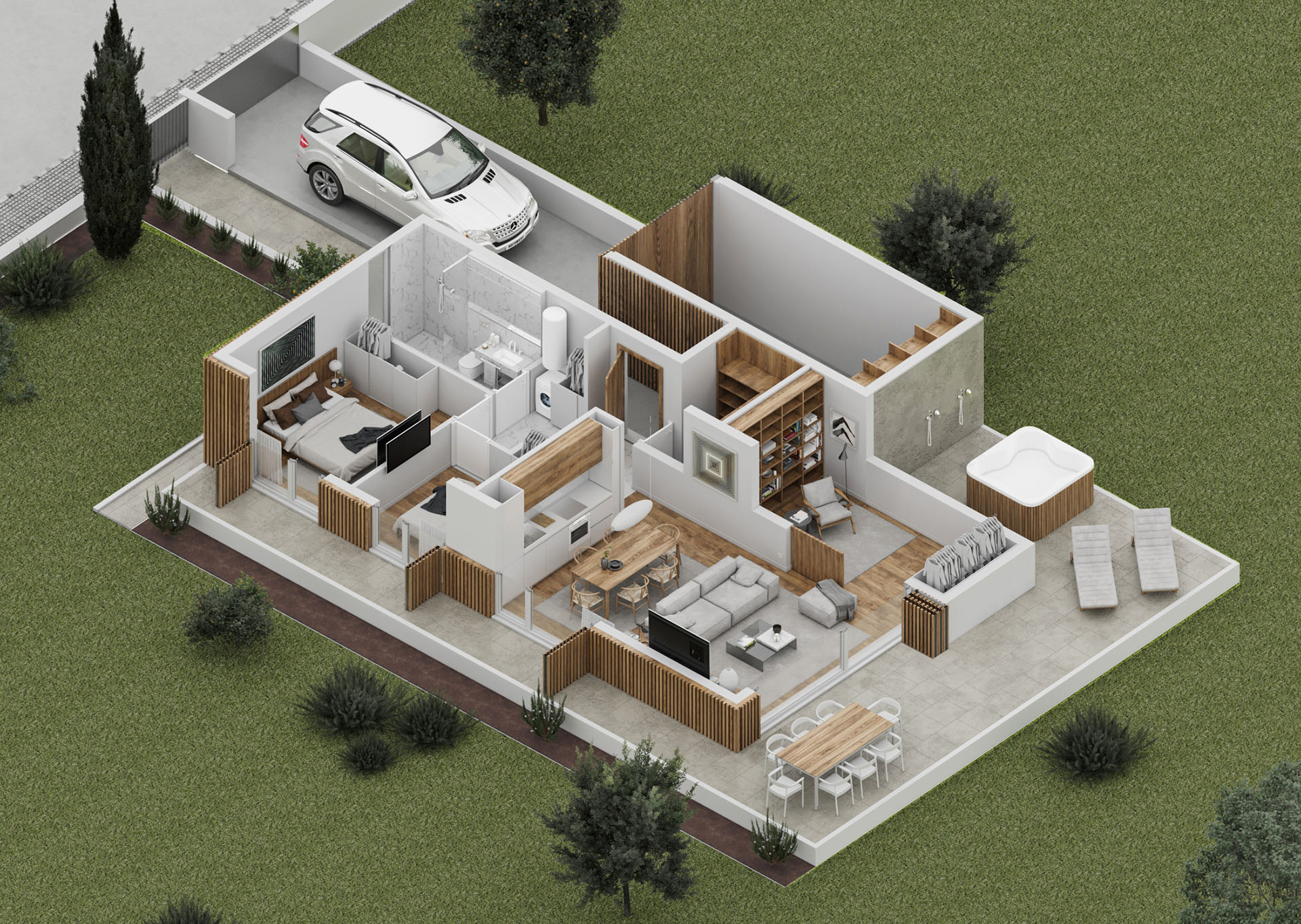 Svaki objekat poseduje prostrano dvorište, privatni džakuzi (opcija) i garažu sa dva dodatna parking mesta, kao i energetski efikasan sistem grejanja i pripreme tople vode u sistemu sa toplotnom pumpom.