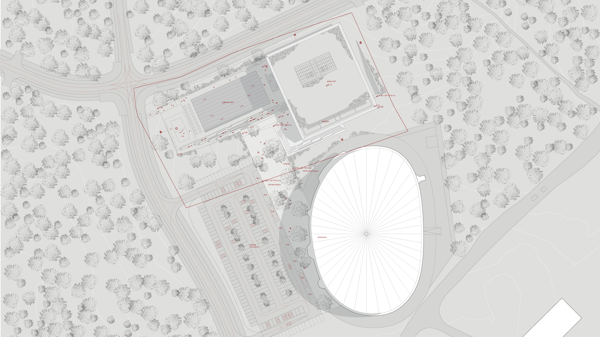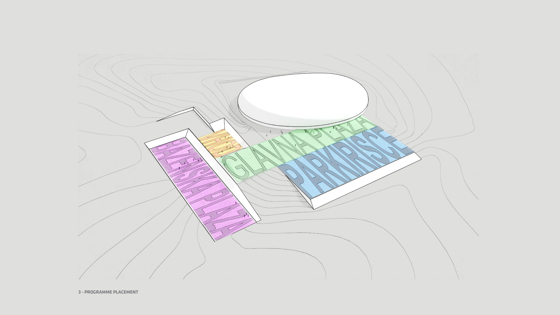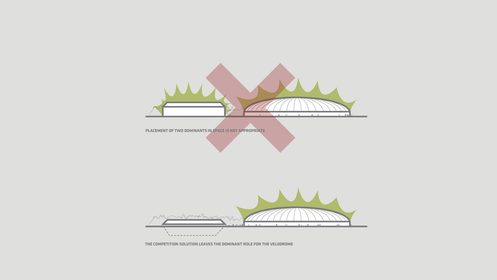 „Reorganizacija i proširenje postojećih saobraćajnih površina velodroma omogućava postavljanje velike ulazne platforme, svojevrsnog centralnog trga namenjenog pešacima koji može da primi velik broj posetilaca tokom događaja i poveže obe zgrade u jedan sportski kompleks“ – zaključuju iz ljubljanskog studija.