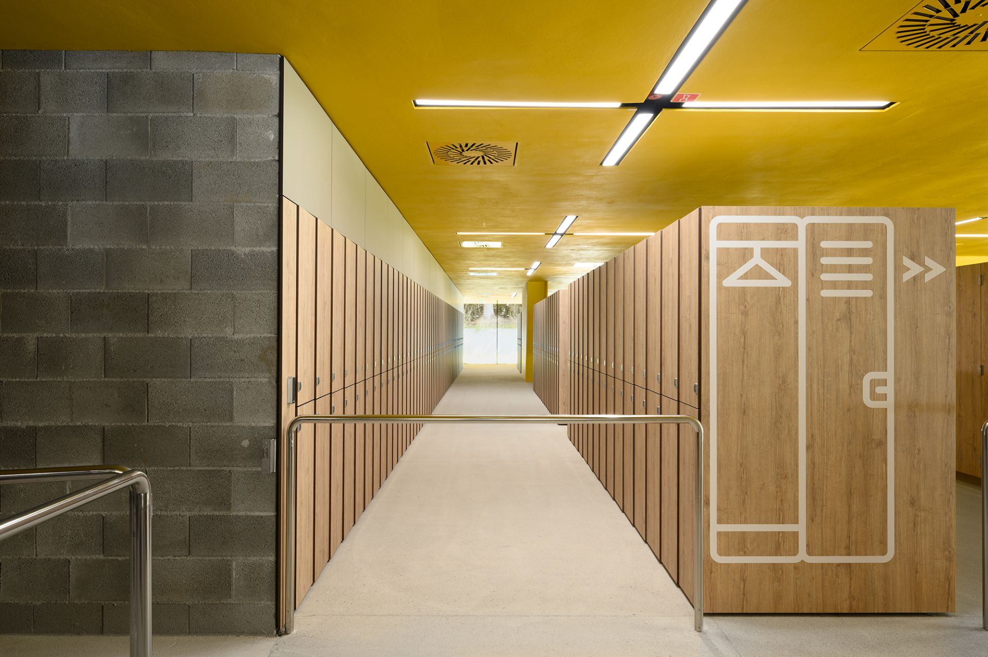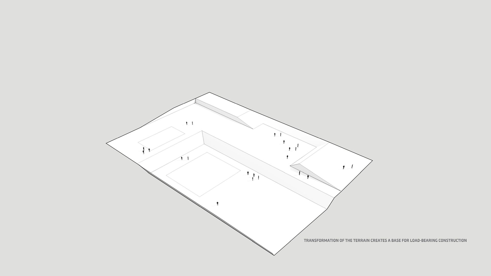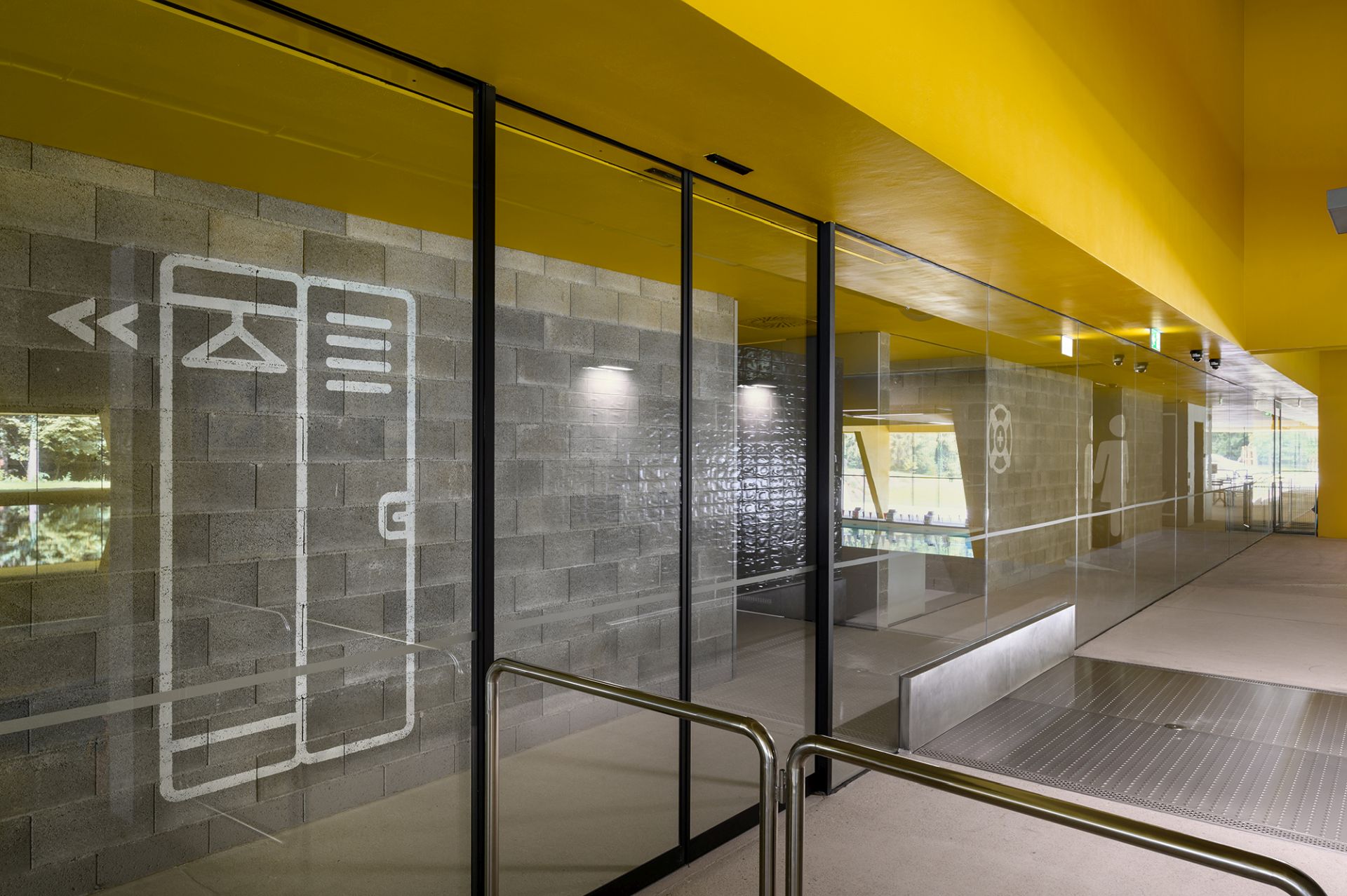 Ulazni hol je time odvojen od saobraćajnih površina, dok najniže ležeći bazenski prostor odgovara koti okoline na najzapadnijoj ivici prostora. Obale usečenog terena pretvaraju se u tribine za posetioce.