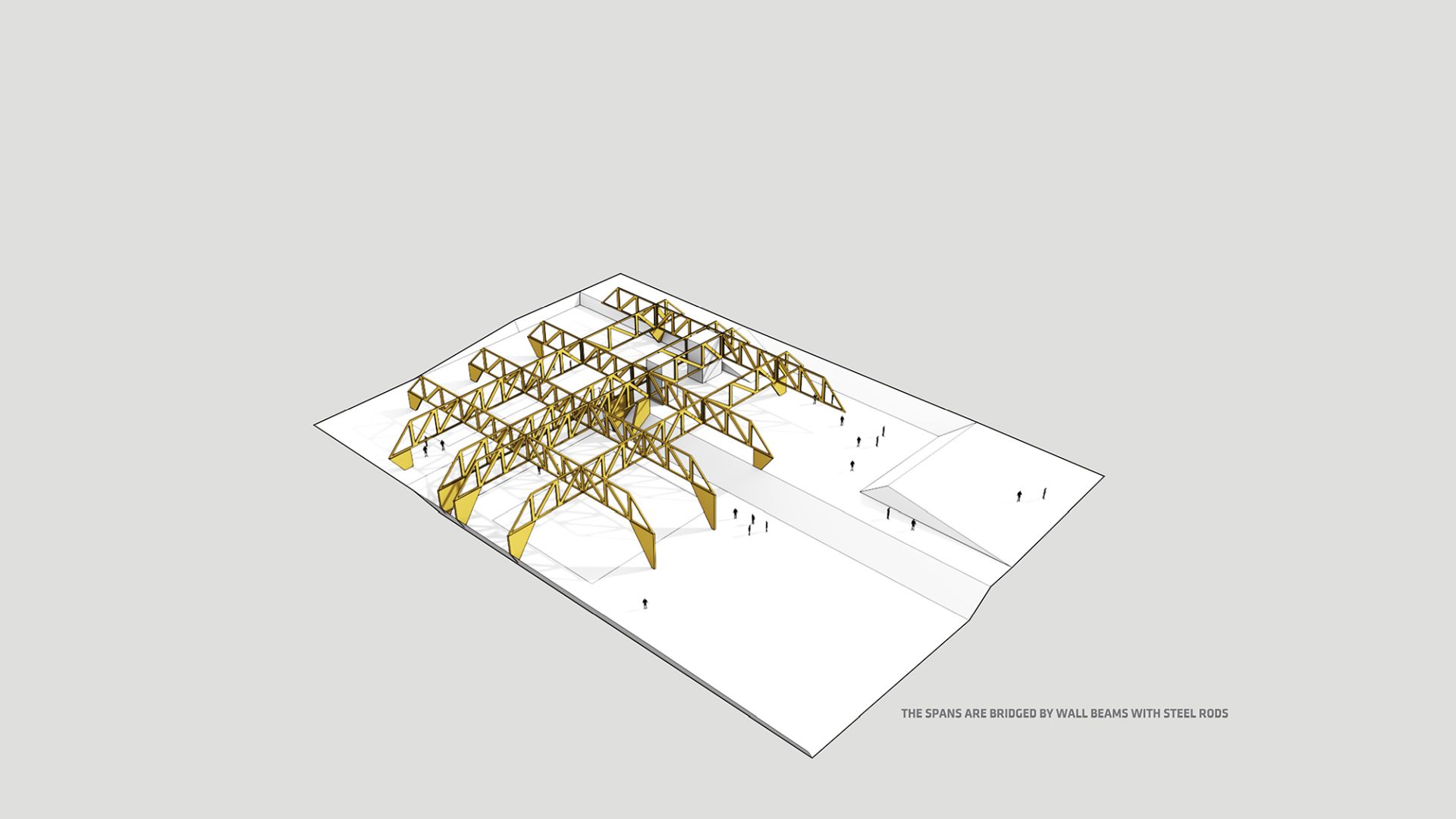 Strukturalni dizajn krova sa rešetkom zasnovanom na zidnim gredama skrivenim u pregradnim zidovima programa omogućava velike raspone i zahteva malo vertikalnih oslonaca.