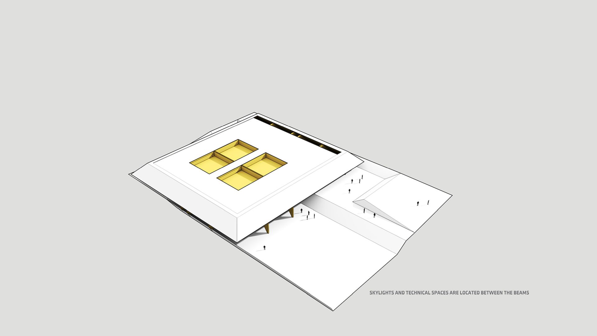 Konzolni krov na ulaznoj strani zgrade deluje kao nadstrešnica, koja zajedno sa ukopanom površinom amfiteatra čini spoljnu ulaznu platformu.