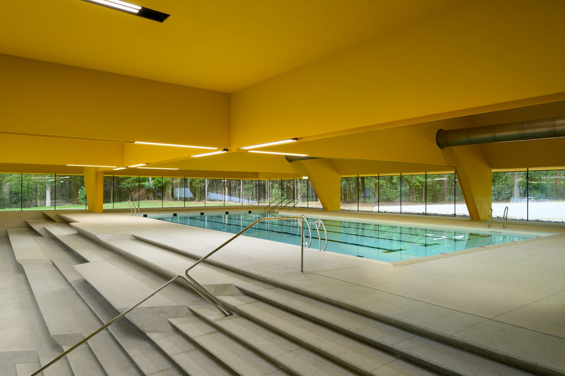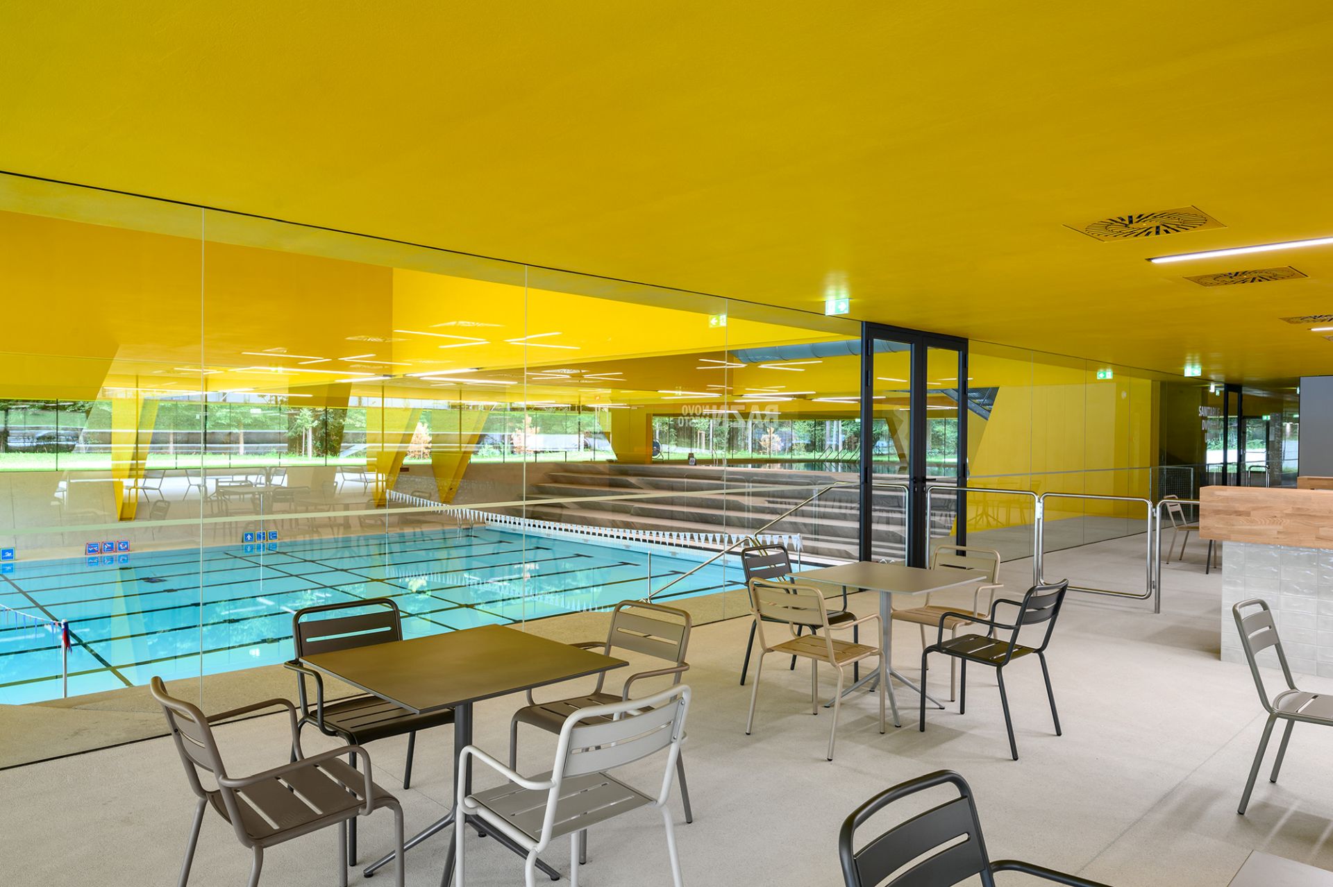 Jedini materijalni akcenat nalazi se u unutrašnjosti zgrade. Donja strana plutajućeg krova bazena je jednolično obojena intenzivnom, toplom nijansom.