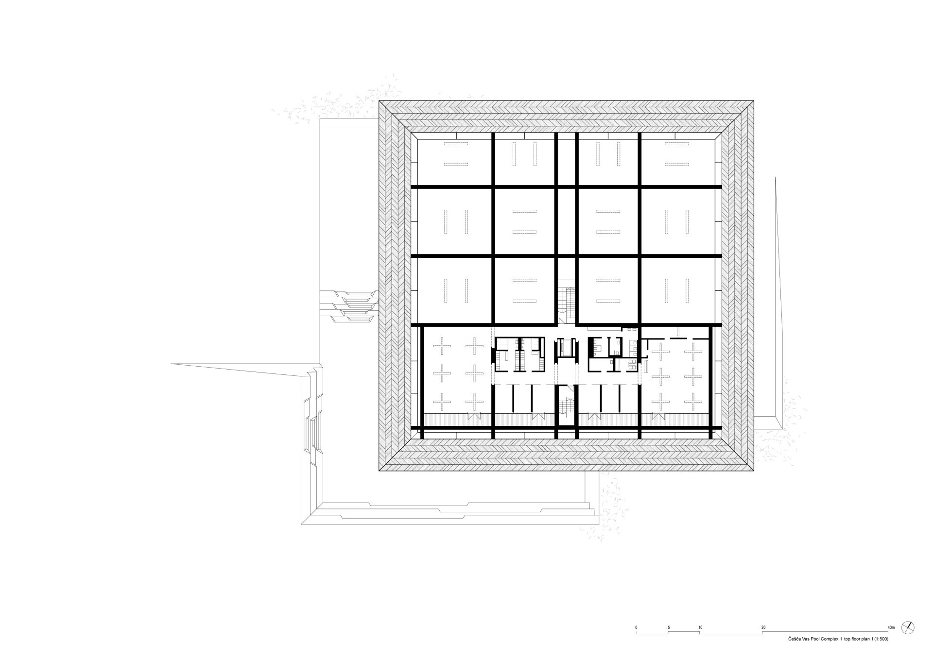 Prigušeni izgled zgrade u prostoru postignut je niskim plutajućim krovom, ispod kojeg je dozvoljeno da okolni pejzaž teče preko bazena.