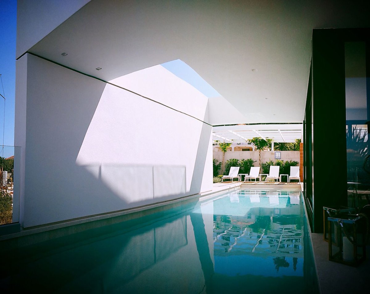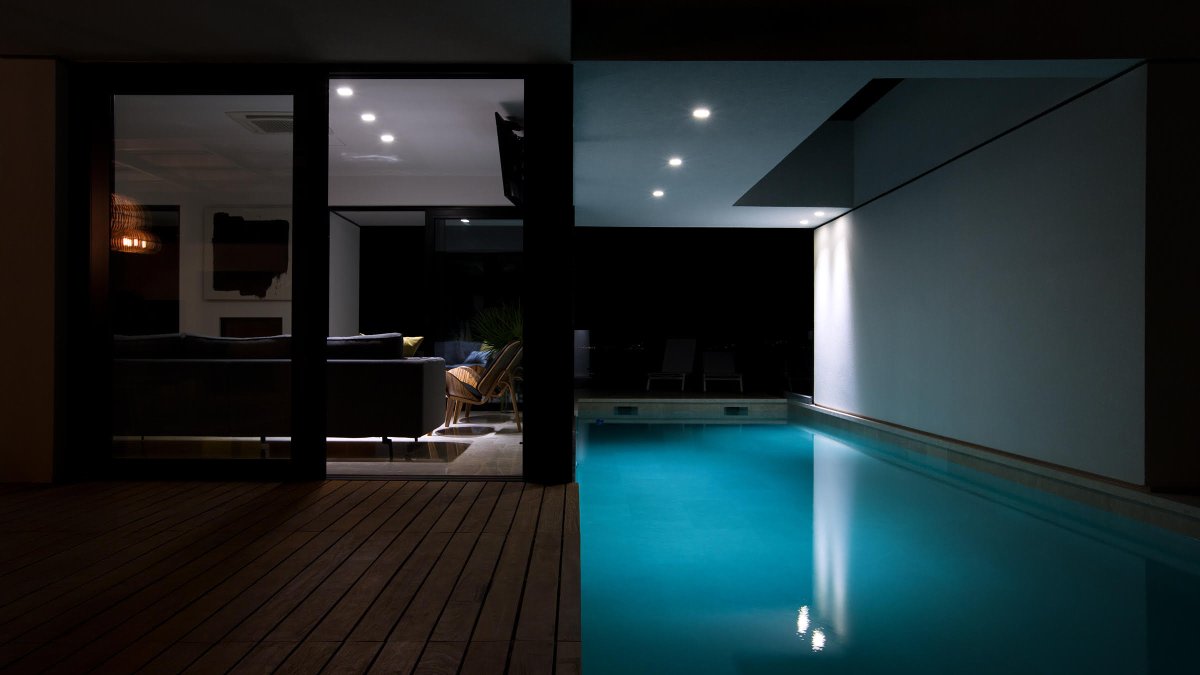 Bazen hrabro prodire u volumen kuće i komunicira sa svim otvorenim i zatvorenim prostorima prizemlja.