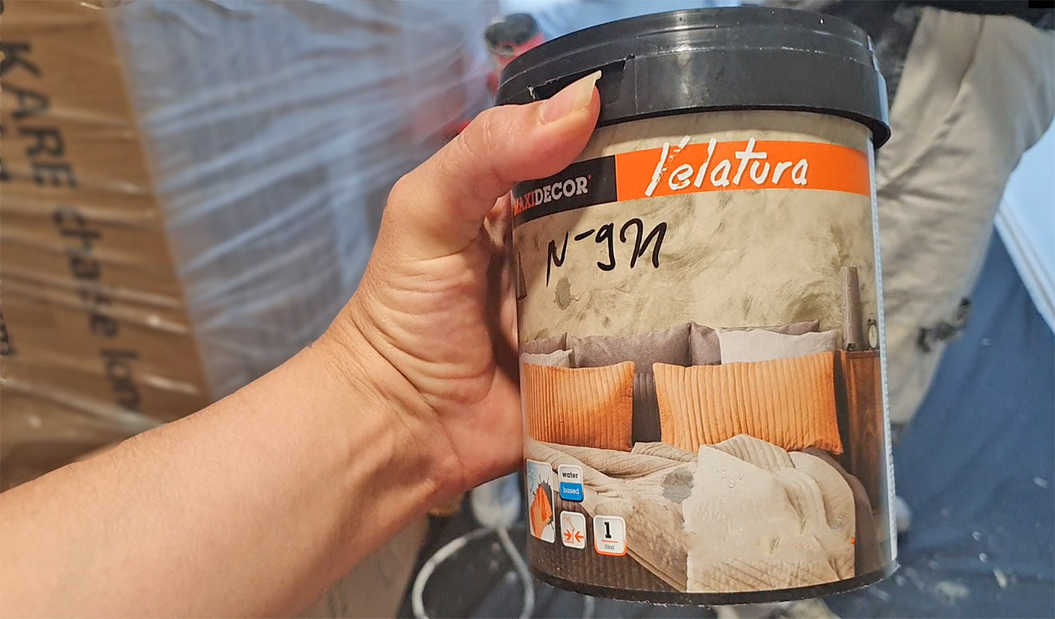 Praškasta smesa dekorativnog maltera meša sa vodom uz pomoć ručnog miksera. Mi smo koristili MaxiDecor concrete dekorativni malter ali na tržištu postoje i drugi brendovi dekorativnih maltera. U kofu s vodom dodaje se praškasta masa (odnos prema uputstvu proizvođača) i započinje se sa mešanjem. Savet majstora je da se nakon mešanja ostavi malo da materijal odstoji u kofi (oko 5 minuta) a da se potom ponovo dobro umeša mikserom.