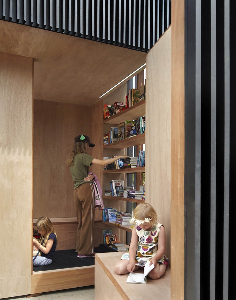 Noću se biblioteka zatvara u kocku i zaključava a LED rasveta, koja se napaja preko solarne ploče na krovu, kroz vertikalne šupljine između letvica sija poput fenjera.