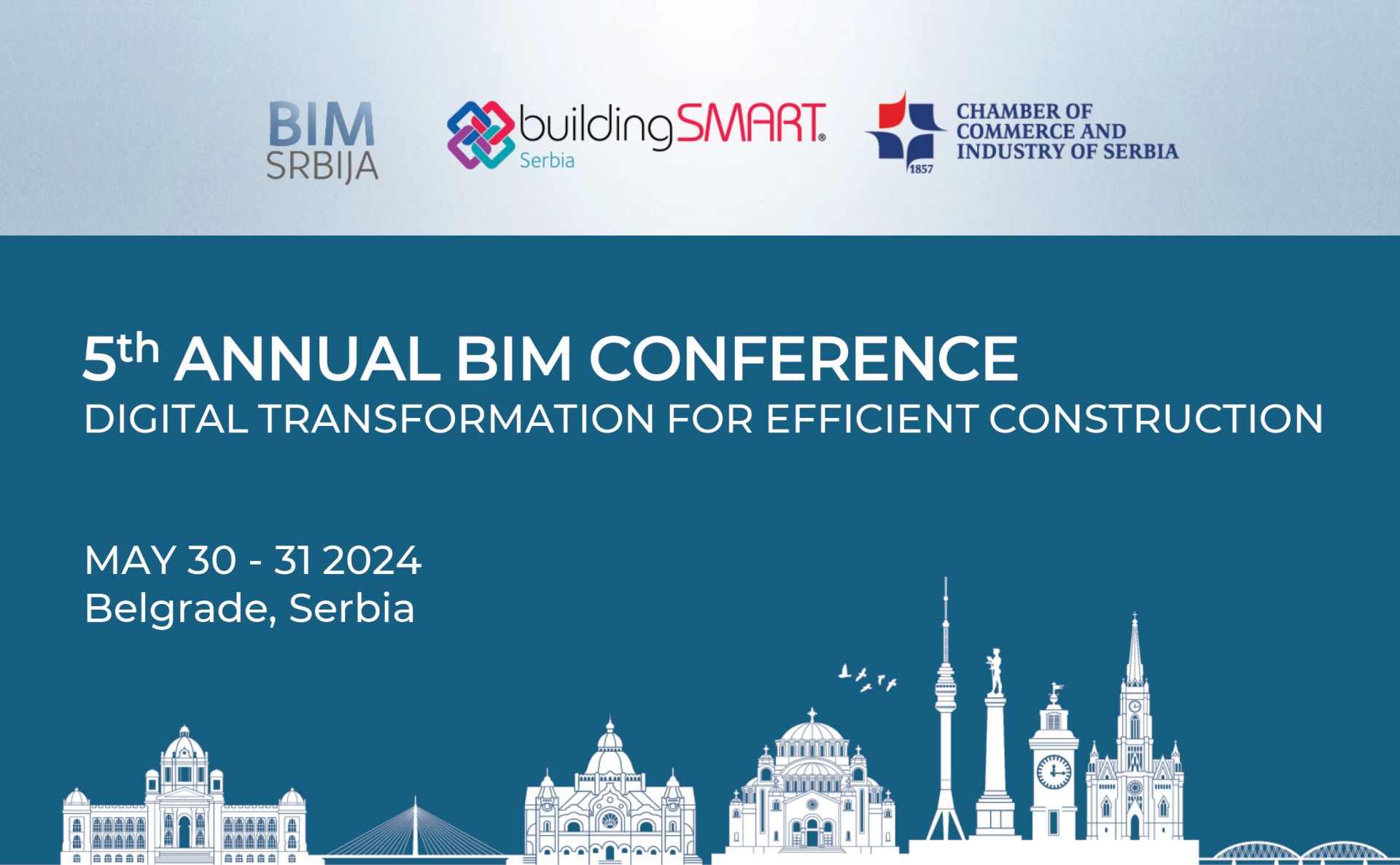 U Domu omladine Beograda 30. i 31. maja 2024. godine (četvrtak i petak) biće održana peta po redu godišnja BIM konferencija Udruženja BIM Srbija, pod nazivom Digitalna transformacija za efikasno građevinarstvo.