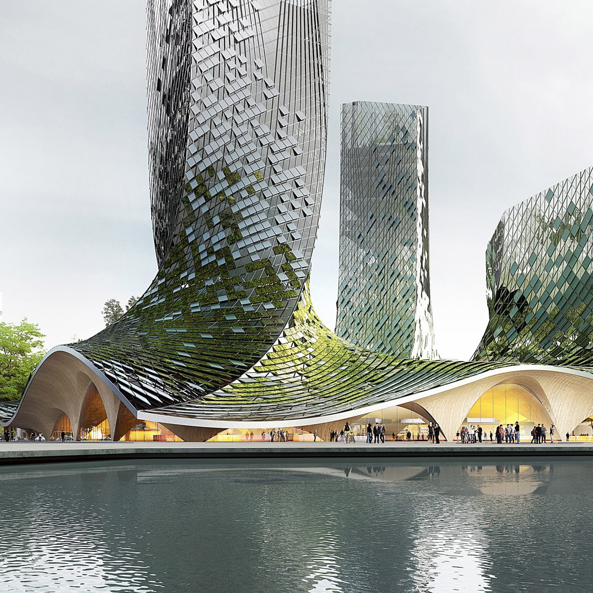 Kineski tornjevi uz to sadrže i panele pokriveni vegetacijom, dok se na vrhovima nalaze prave zelene oaze u obliku plastenika sa drvećem koje filtrira vazduh. Oblik tornjeva, kao i podijum koji se spaja na podnožju su dizajnirani tako da kišnica može da klizi niz bočne strane kula, kroz otvore u sredini, pa sve do bazena u dnu. Ovakvo rešenje nije slučajno, jer je osmišljeno u potpunosti u skladu sa prirodnom okolinom grada.