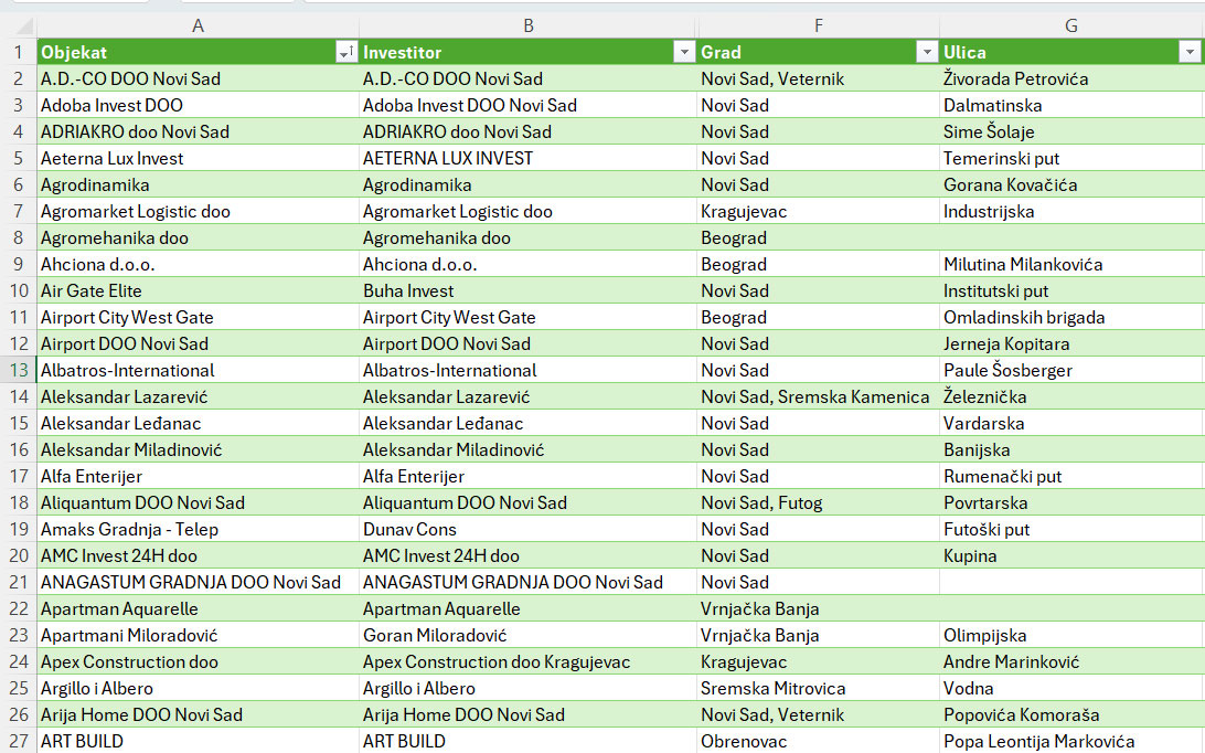 - Filtraciju projekata prema gradu, investitoru, nameni i drugim parametrima