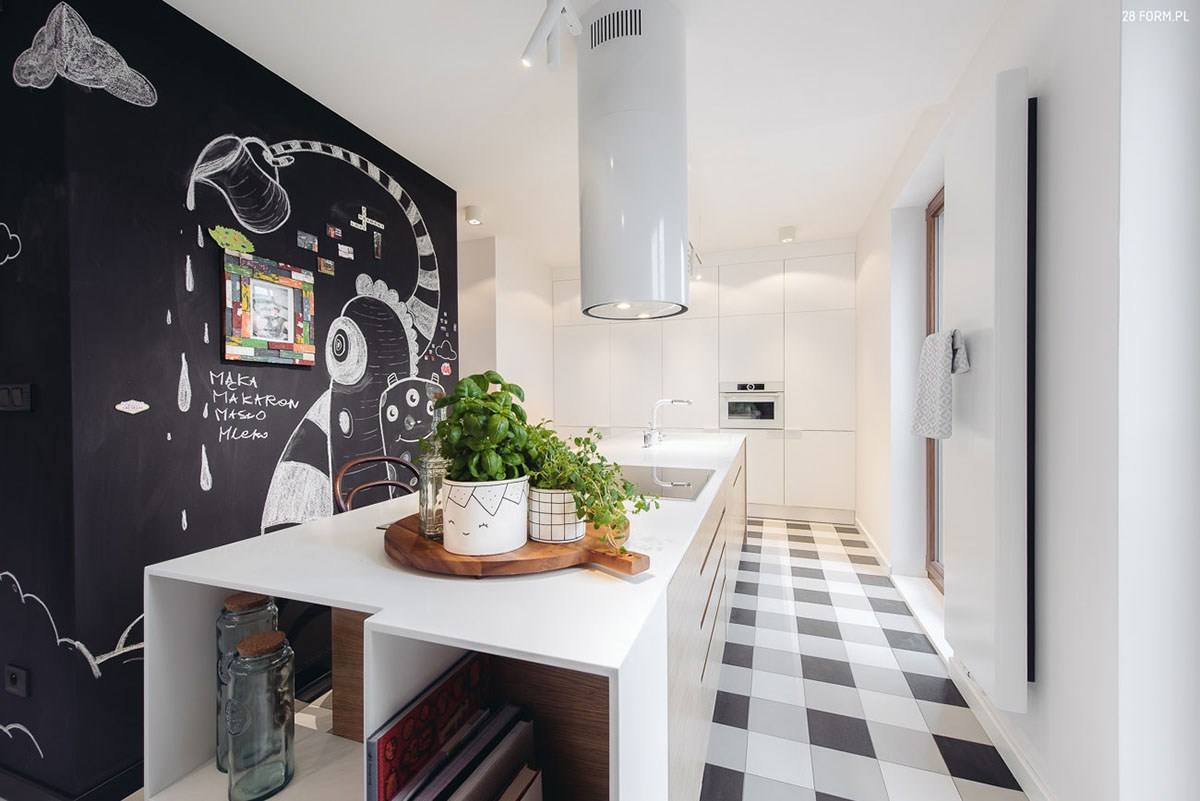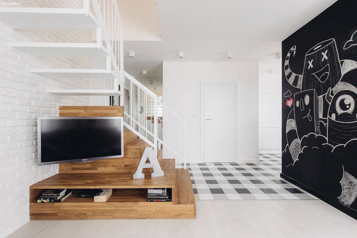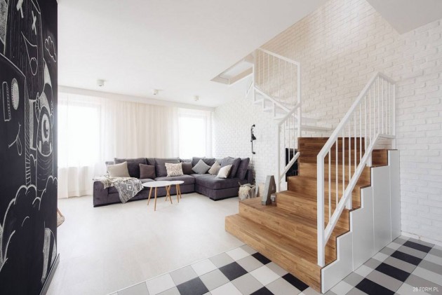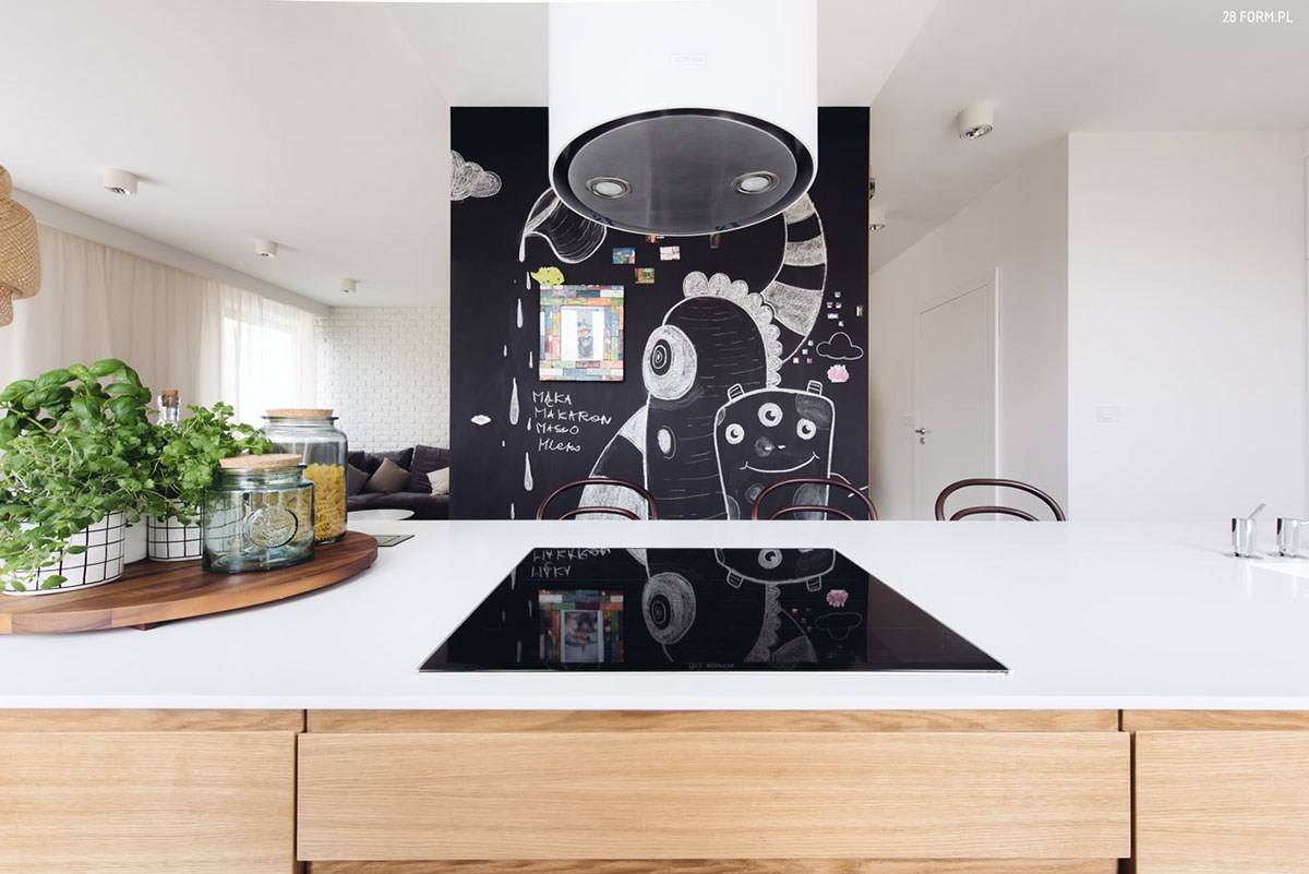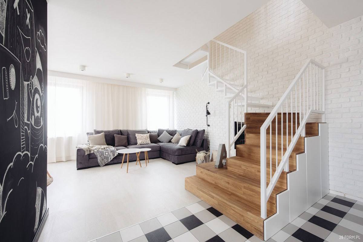 Arhitekte studija 28form vešto su boje zamenili jakim teksturama: belom opekom i crnom zidom na kojem se piše kredom. Ceo enterijer je u skandinavskim stilu, čija je odlika upotreba svetlih tonova u u kombinaciji s prirodnim materijalim kao što su drvo ili lan. Upravo je to ono što čini enterijer toplim i udobnim a ujedno vrlo atraktivnim i savremenim.